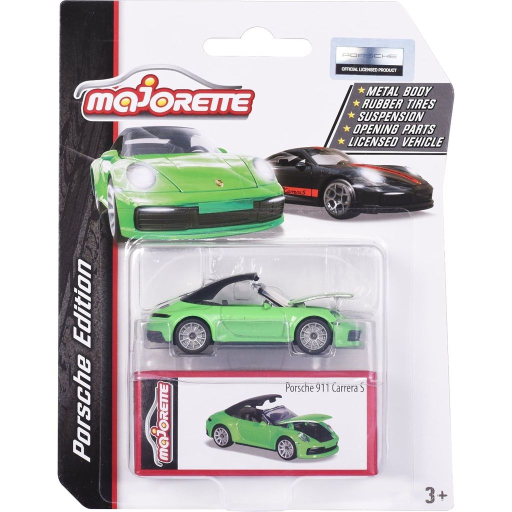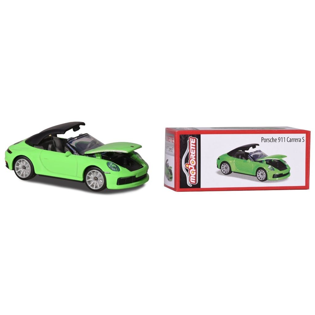 Porsche 911 Carrera S från Majorette i skala 1:60, ca 7,5 cm lång. Bilen kommer förpackad tillsammans med en liten kartonglåda / samlingslåda som kan användas till förvaring om man önskar.