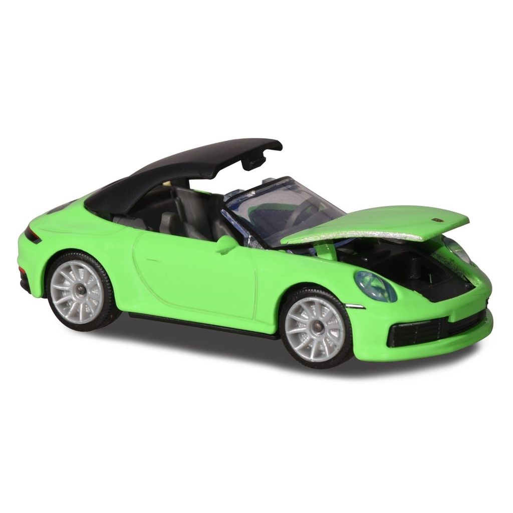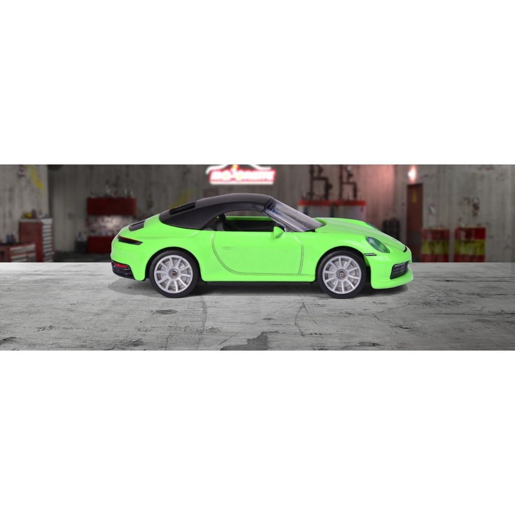 Leksaksbil i form av en grön Porsche 911 Carrera S från Majorette i skala 1:60, ca 7,5 cm lång.