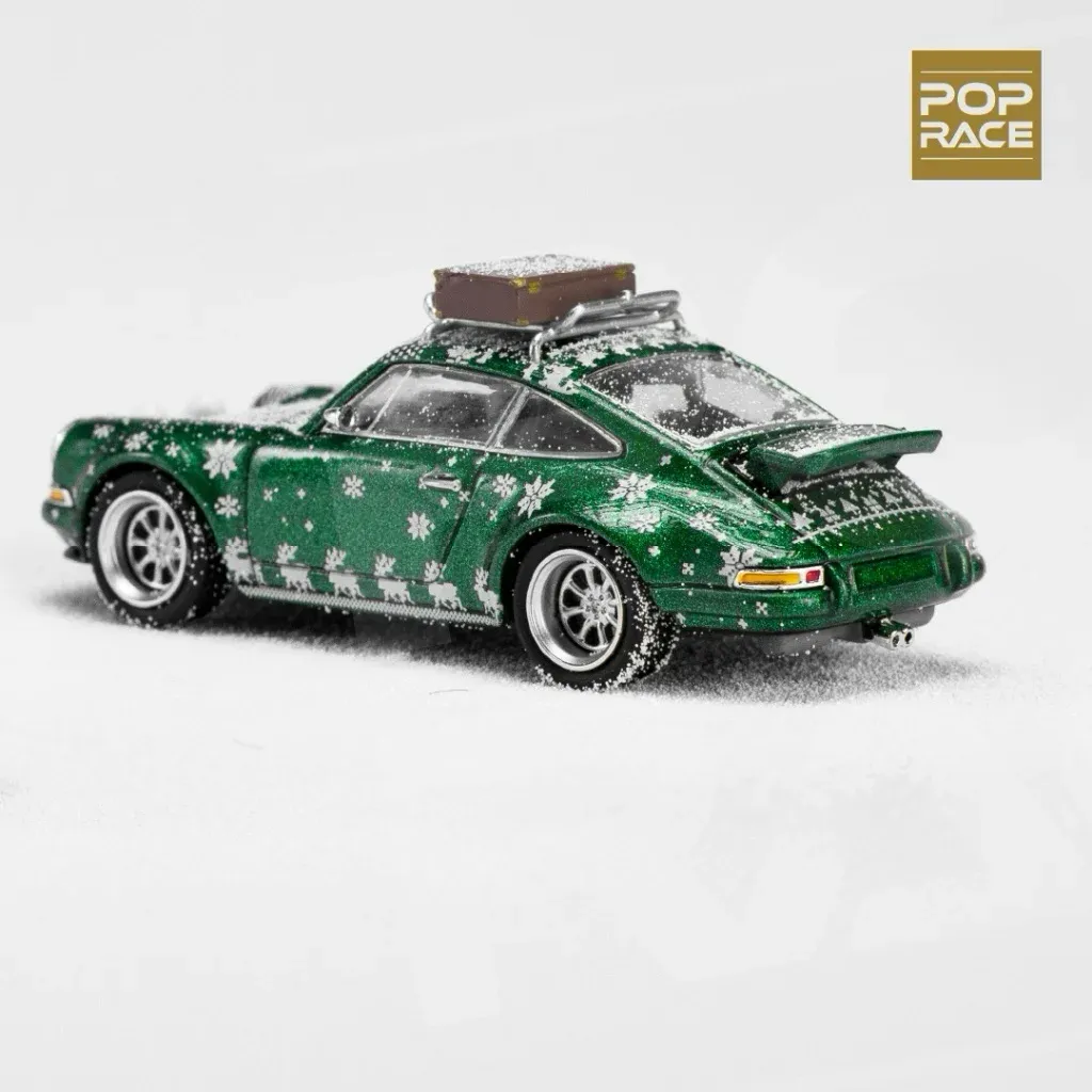 Porsche 911 (964) Carrera Singer Christmas Edition som liten modellbil i skala 1:64 (ca 7 cm) från Pop Race. Porschen är grön (metallic) och dekorerad med vita snöflingor och renar. På takräcket kan vi anta att julklapparna placerats i en brun väska.