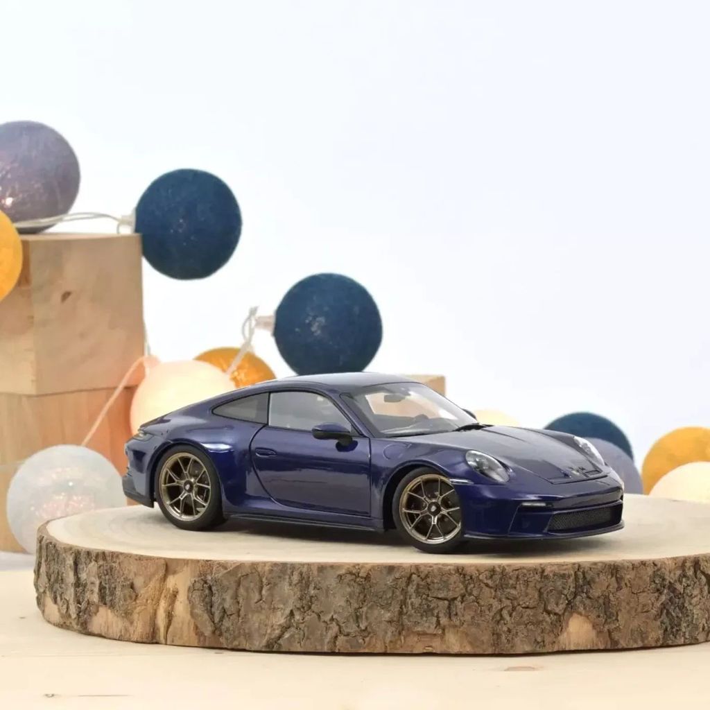 Från franska Norev erbjuder vi denna fina modell av en blåmetallic Porsche 911 GT3 (2021) i skala 1:18 (25 cm).