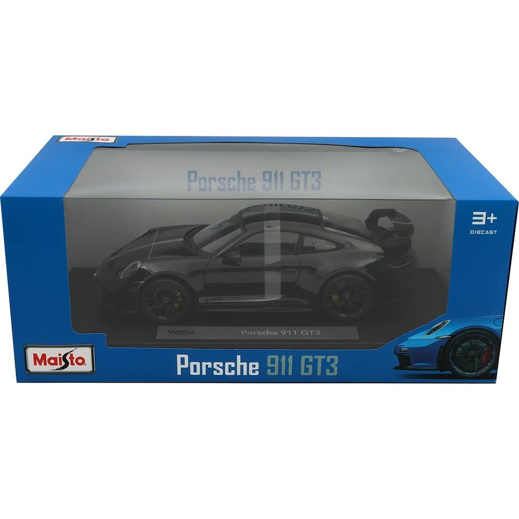 Svart (med silverrand) Porsche 911 (992) GT3 som modellbil från Maisto i skala 1:18 (26 cm).
