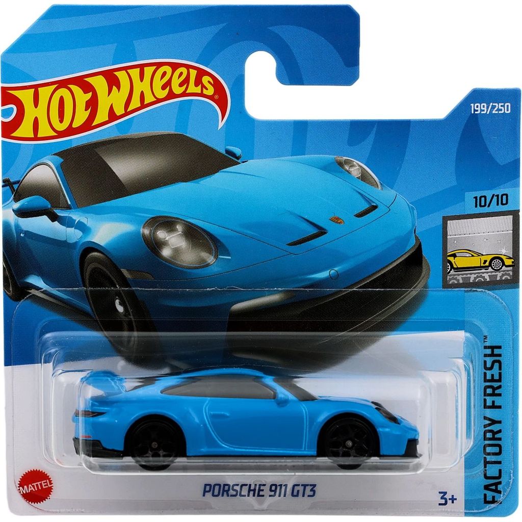 Porsche 911 GT3 från Hot Wheels och serien Factory Fresh där denna leksaksbil är bil nummer 10/10. Bilen är nummer 199/250 från 2022 och har ett short card (5785).