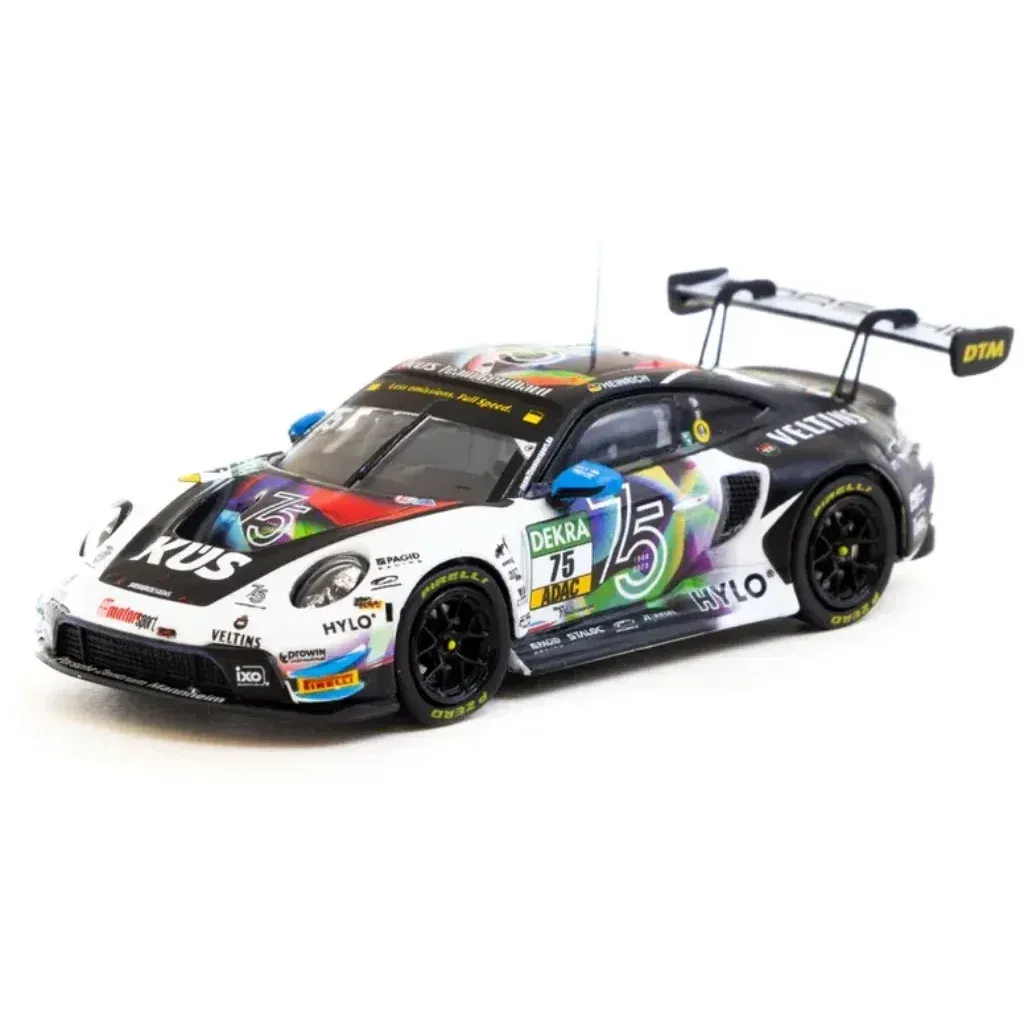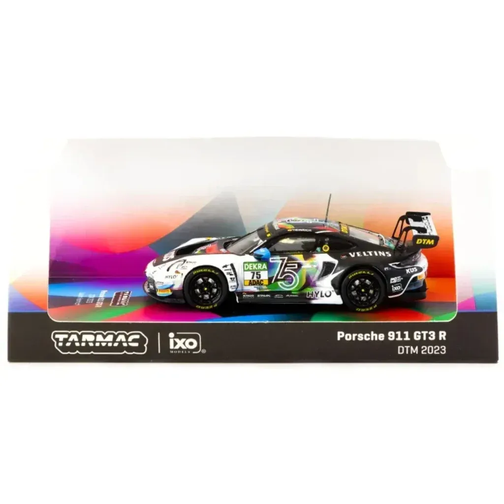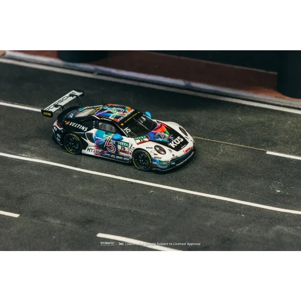 Porsche 911 GT3 R från Tarmac Works i skala 1:64 (7,5 cm). Bilen kördes under DTM 2023 av Laurin Heinrich. Modellen har tagits fram i ett samarbete mellan Tarmac Works och Ixo Models och ingår i Tarmacs serie HOBBY64.