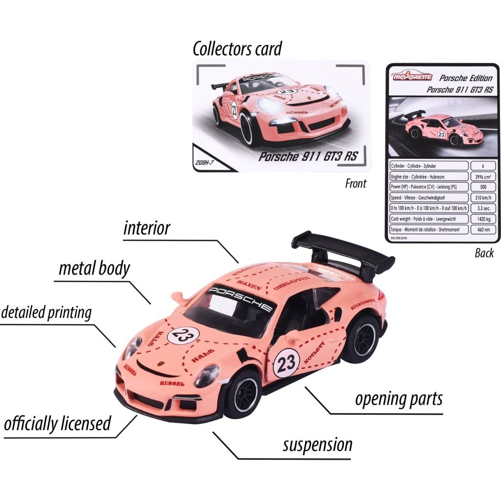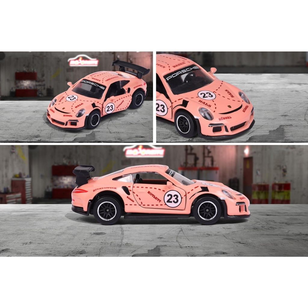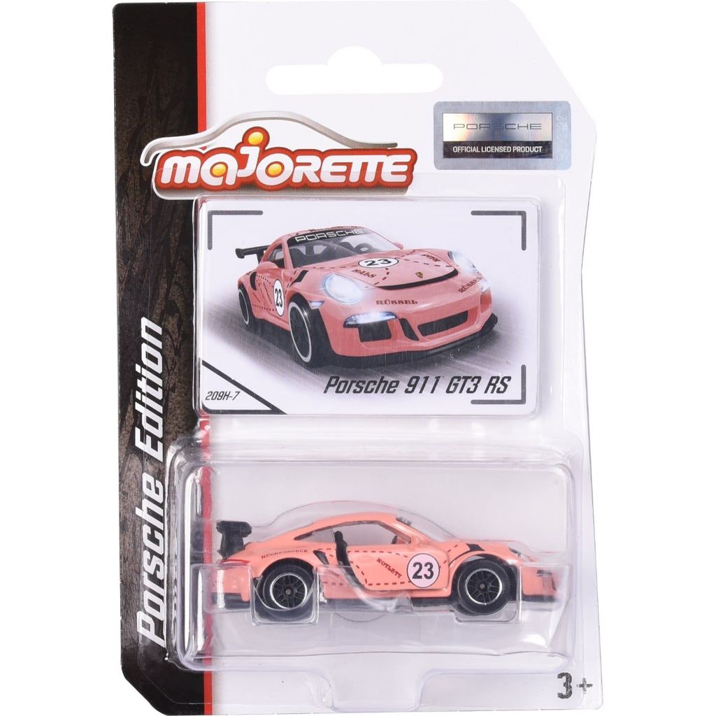 En rosa Porsche 911 GT3 RS som leksaksbil i metall från franska klassiska leksaksbilstillverkaren Majorette. Bilen ingår i serien Porsche Edition. Porschen är 7,5 cm lång och har öppningsbara dörrar.