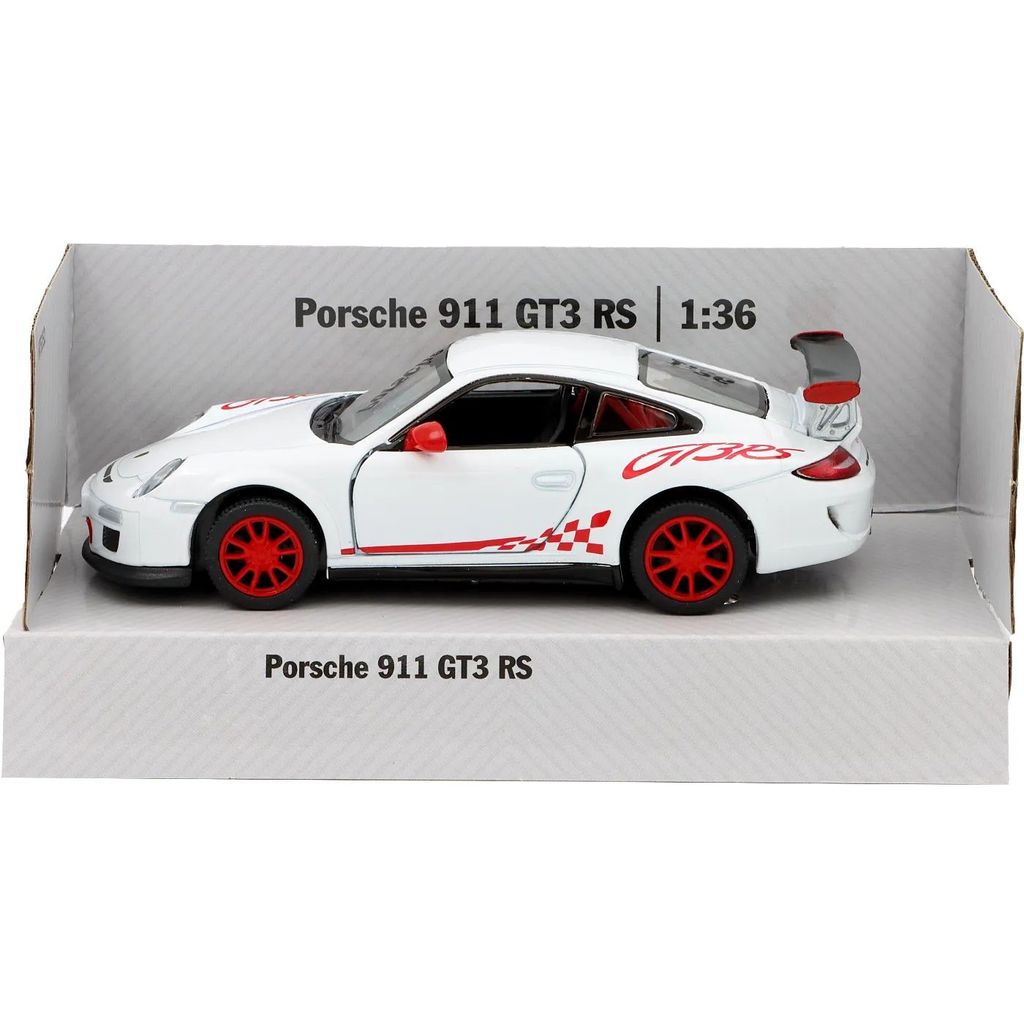 Vit och röd Porsche 911 GT3 RS från Kinsmart i skala 1:36 (längd 13 cm).