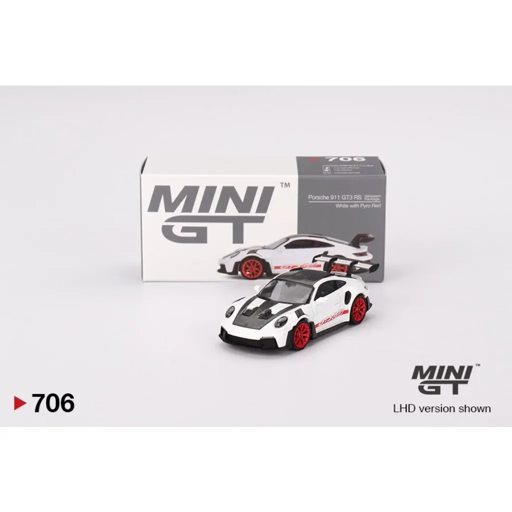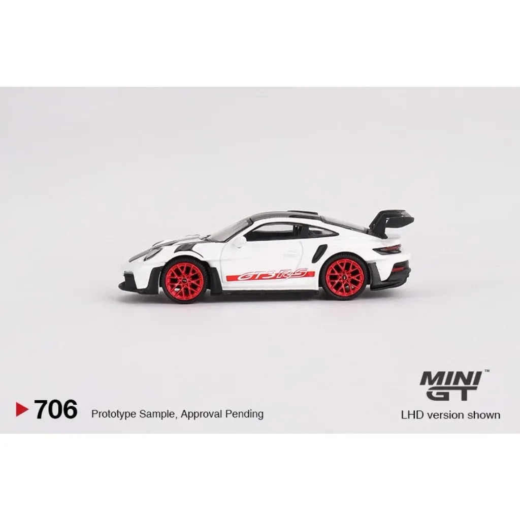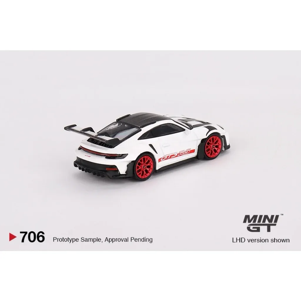 Porsche 911 GT3 (992) RS i vitt med röda detaljer och ett performancepaket från Weissach Package. Modellen är tillverkad av Mini GT i skala 1:64 (ca 7 cm).