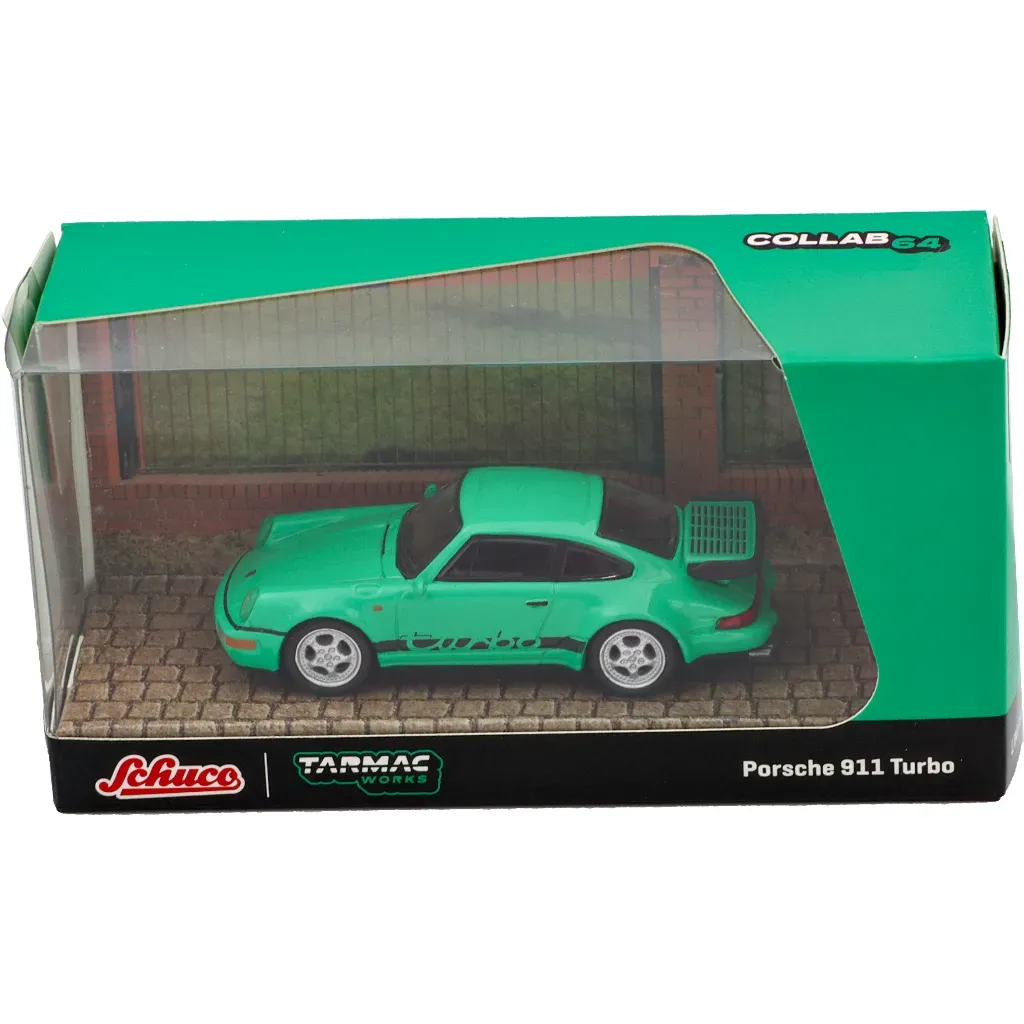 Porsche 911 Turboi grönt som modell från Tarmac Works i samarbete med Schuco. Modellen ingår i Tarmacs serie COLLAB64.