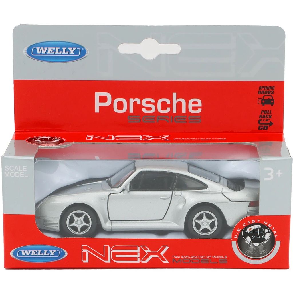 Porsche 959 i silver från Welly. Öppningsbara dörrar. Bilen är 11,5 cm (skala ca 1:34-1:39).