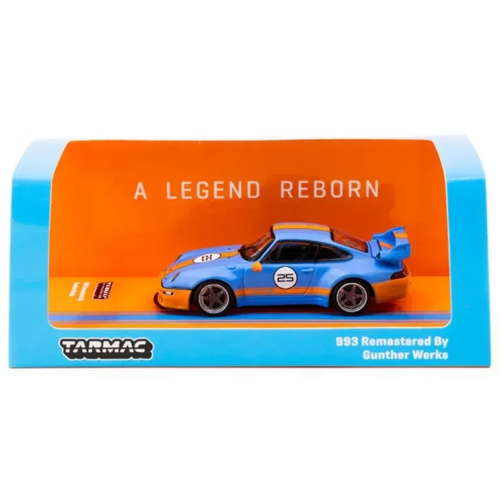 Blå och orange Porsche 993 Remastered by Gunter Werks från modellbilstillverkaren Tarmac Works och serien HOBBY64 i skala 1:64 (6,7 cm).