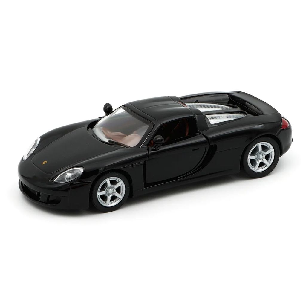 Porsche Carrera GT i svart. Bilen har pullback och öppningsbara dörrar.