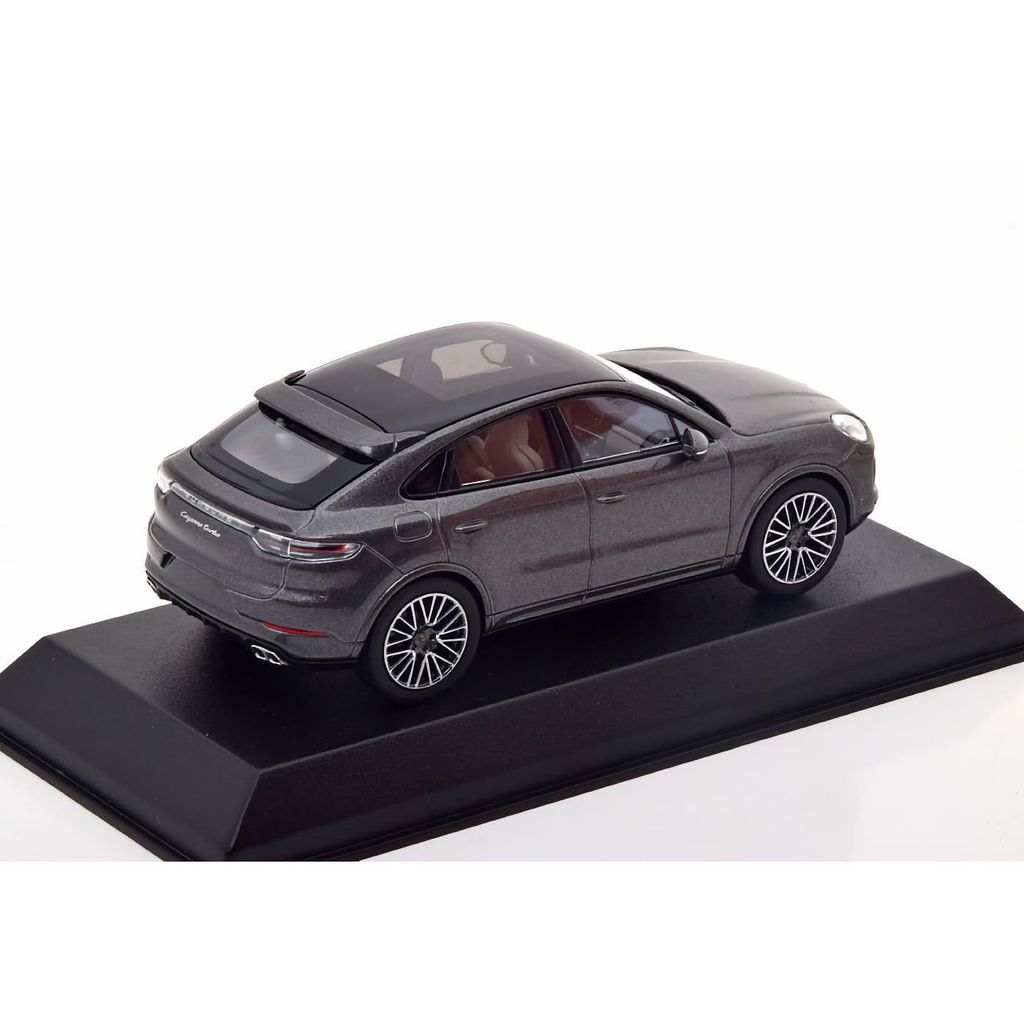 Modellbil i form av en grå Porsche Cayenne Turbo Coupé årsmodell 2019 i skala 1:43. Modellen är producerad av Norev.