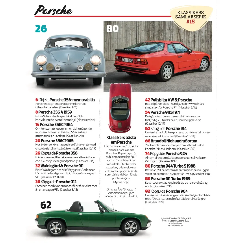 Tidningen är nummer 15 i serien Klassikers Samlarserie som utges av OK Förlaget. Tidningen innehåller artiklar från Klassikers produktion om den tyska biltillverkaren Porsche. Artiklarna har fokus på tidsspannet 1950-talet fram till 1980-talet.