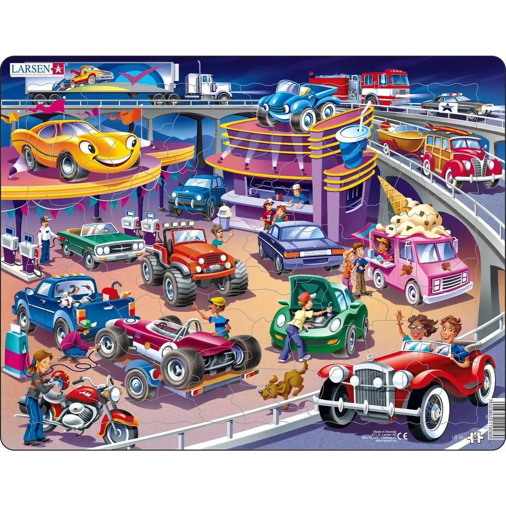 Pussel i högkvalitativ kartong från norska Larsen. Pusslet består av 58 pusselbitar föreställandes en bilverkstad med full aktivitet.