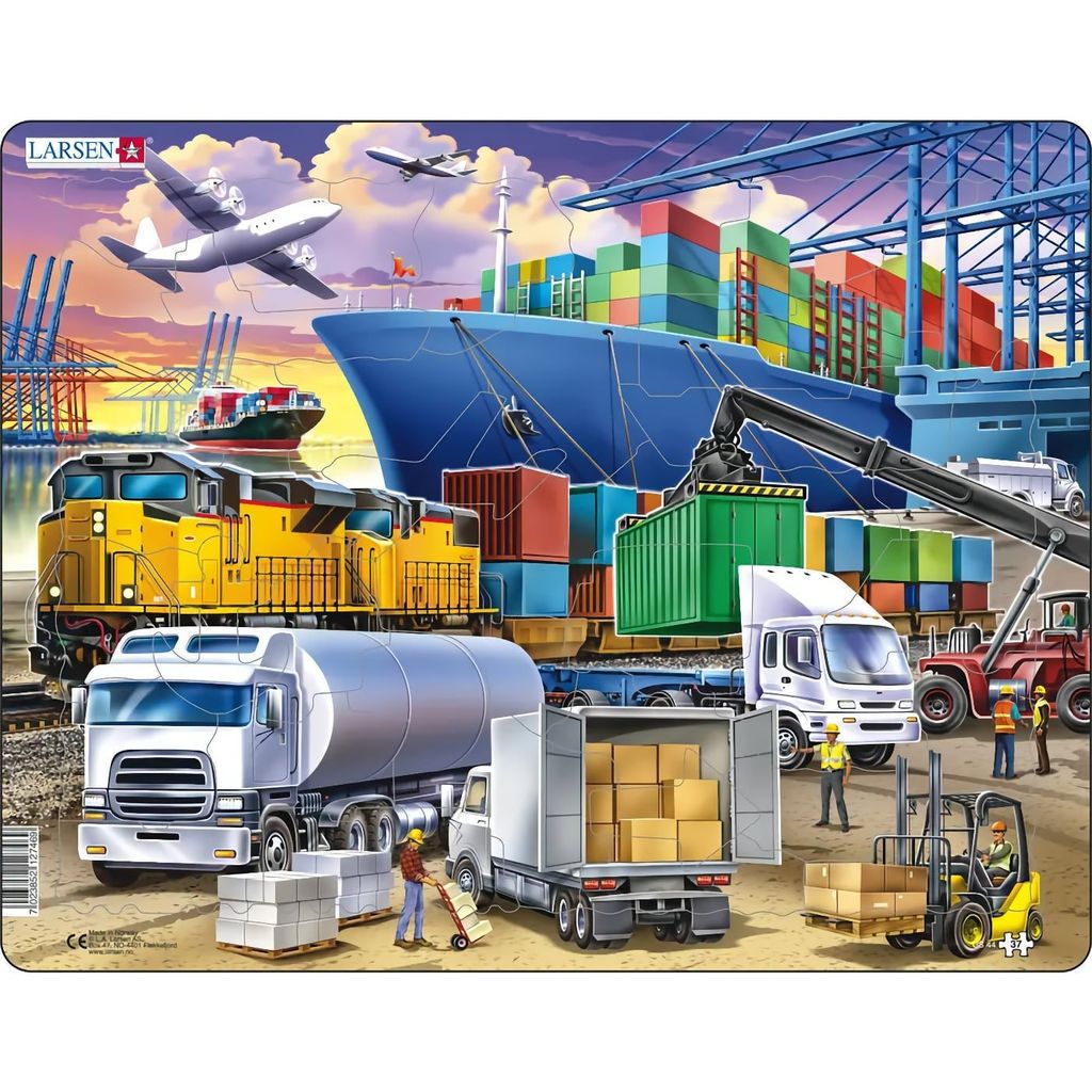 Ett fint pussel med 37 bitar från norska varumärket Larsen. Motivet föreställer en mängd transportfordon i en hamn. Ett stort containerfartyg syns i bakgrunden och i förgrunden ser vi bland annat lastbilar, godståg, truck och transportarbetare.