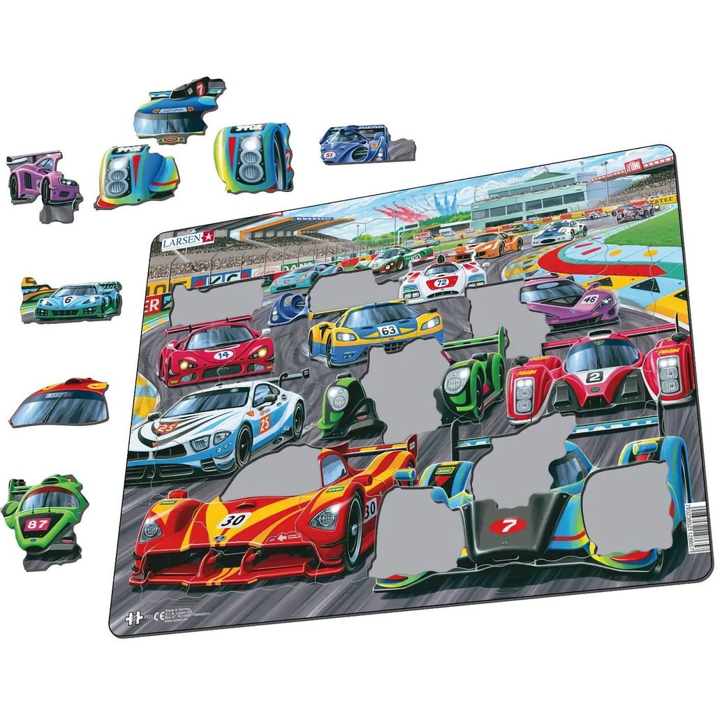 Larsenpussel med motiv som föreställer ett tjog (ca 20 =)) racerbilar på en motorstadion. Pusslet som kommer från norska Larsen är färgglatt och händelserikt och lockar till pusslande flera gånger om.