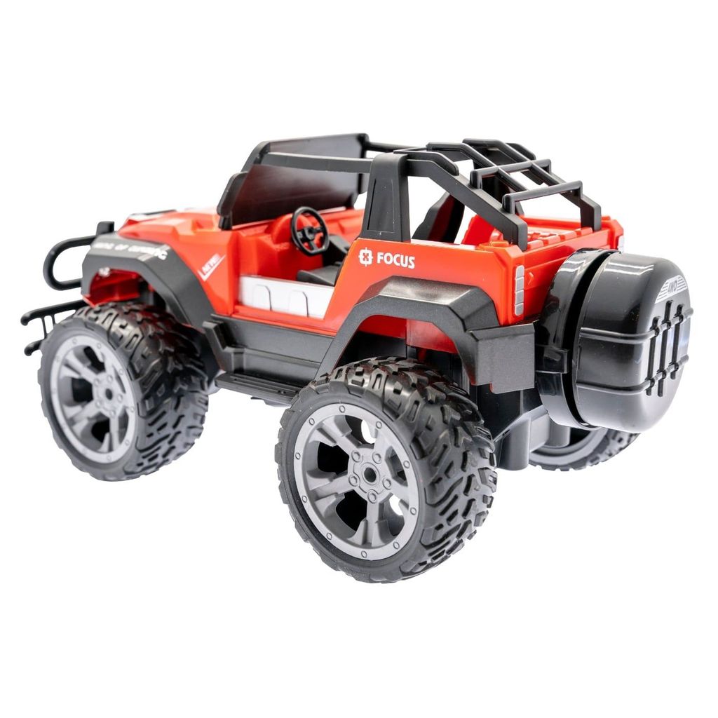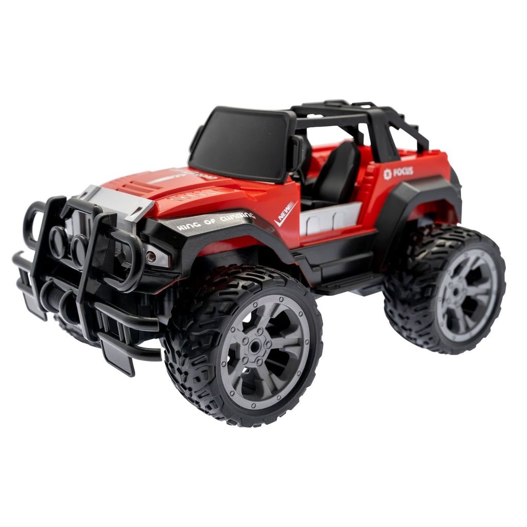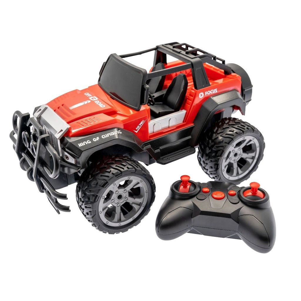Denna röda radiostyrda jeep har en "traditionell" handkontroll med två spakar för att gasa, backa och svänga. RC-bilen kommer från det svenska varumärket G4P (Gear4Play). Bilen är i skala 1:16 vilket i detta fall innebär en längd på 28 cm. Bilen har ledbelysning och kommunicerar över frekvensen 2,4 GHz som möjliggör körning av flera radiostyrda bilar samtidigt utan att de stör ut varandra. Bilens medföljande batteri laddas enkelt med den USB-kabel som också ligger med i förpackningen. Till handkontrollen behövs 2 st AA-batterier.