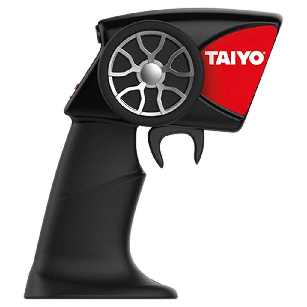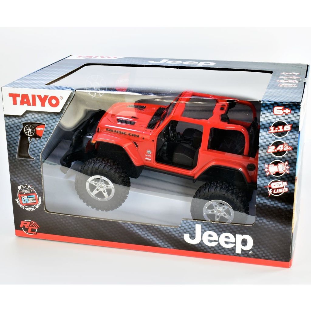 Radiostyrd Jeep Wrangler Rubicon från Taiyo. Jeepen är röd och framförs med den medföljande handkontrollen. Bilen har ett inbyggt batteri som laddas med en USB-kabel.