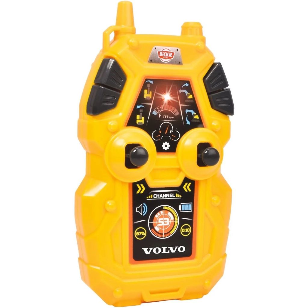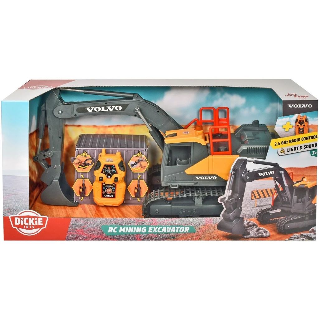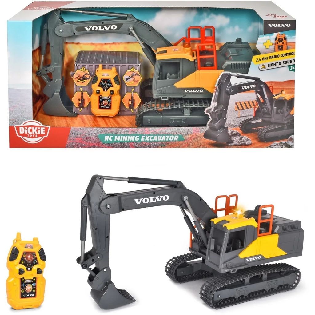 RC Mining Excavator är en stor radiostyrd Volvo-grävmaskin från Dickie Toys. Grävaren är med nedfälld skopa 60 cm lång.