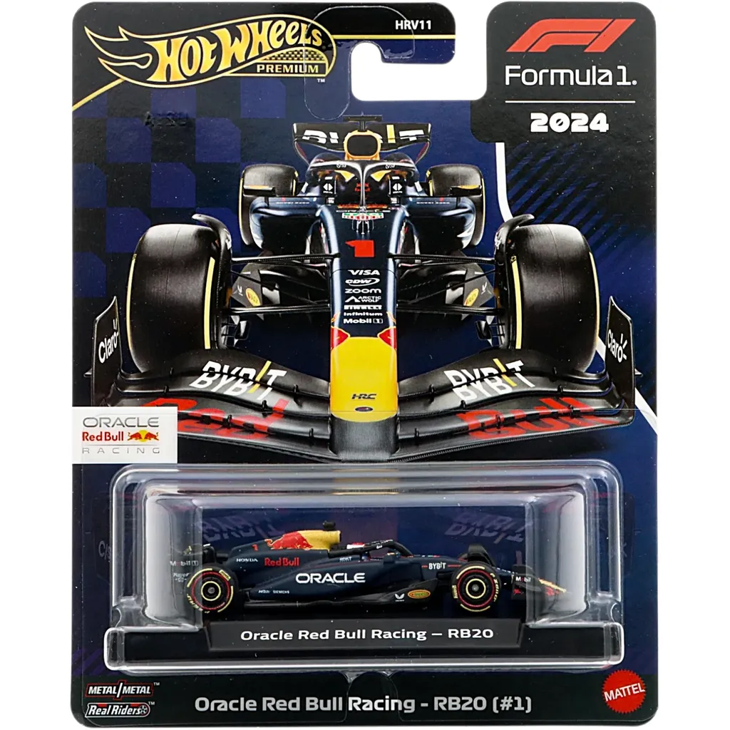 Max Verstappens F1-bil från 2024, Red Bull RB20 #1, som modell från Hot Wheels Premium. Bilen är i skala 1:64 (8,6 cm).