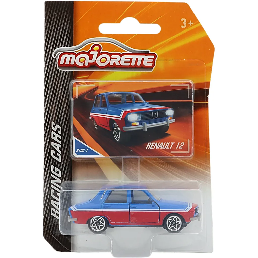 Blå och röd Renault 12 från Majorette och serien Racing Cars. Bilen är 7,6 cm (skala 1:53) och tillverkad i metall med plastdetaljer.