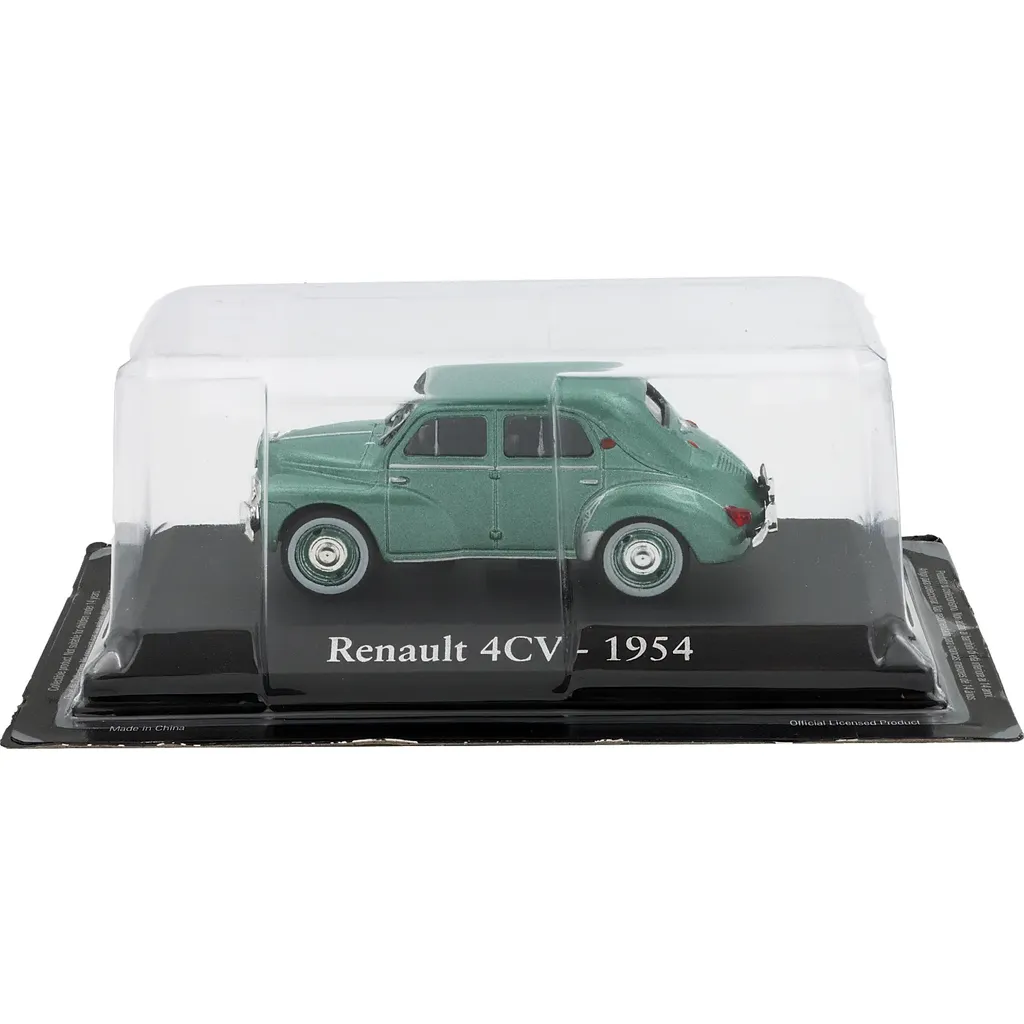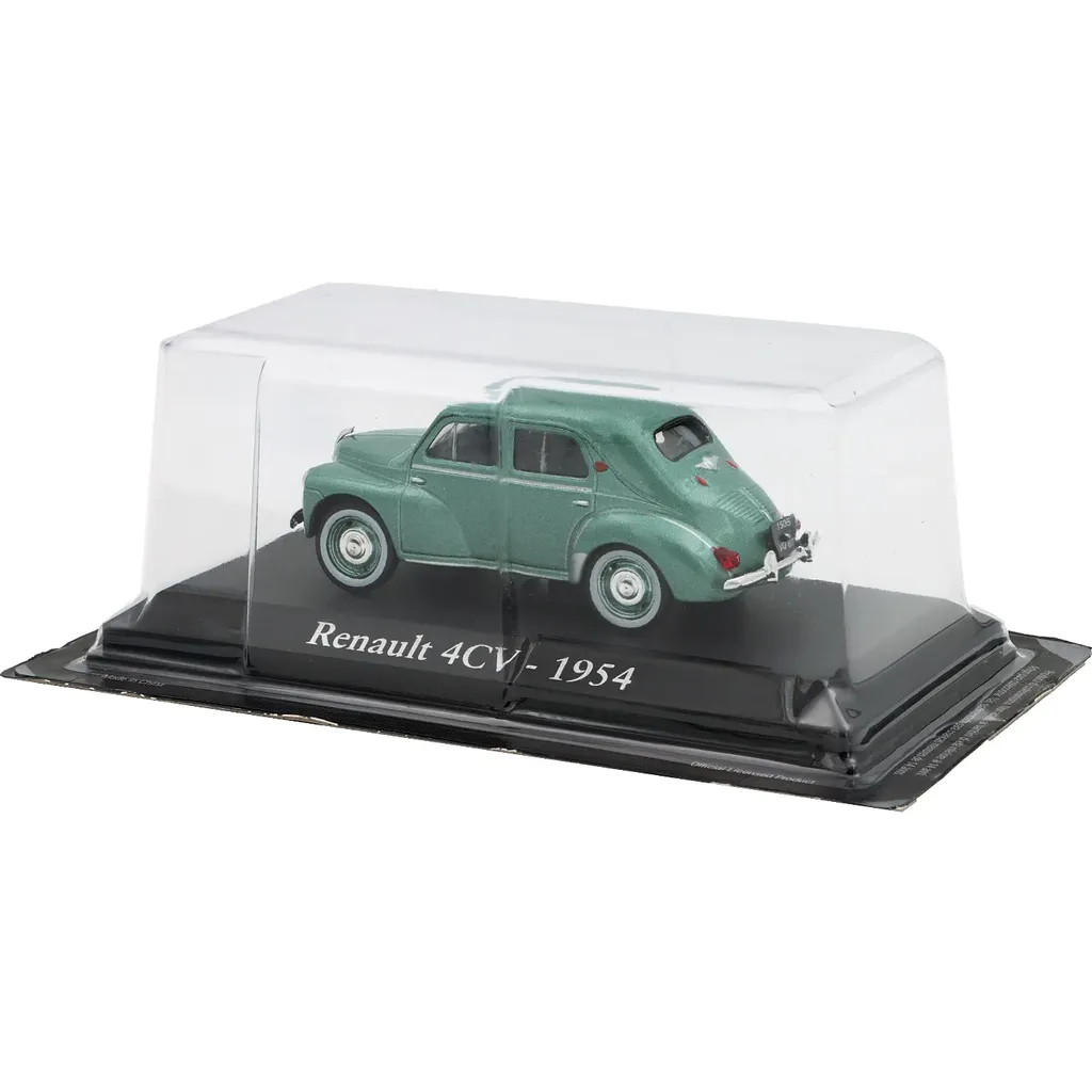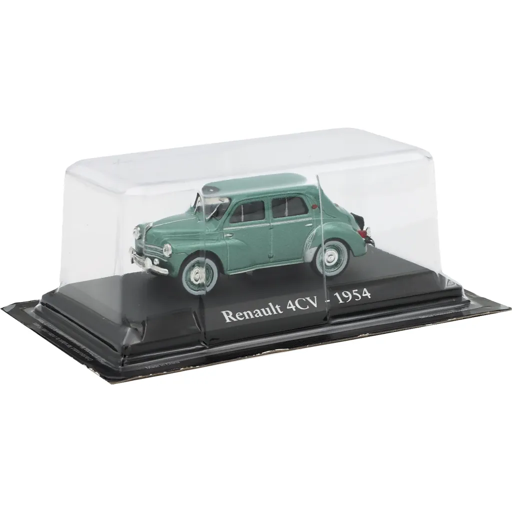 Renaulten levereras stående på en svart bottenplatta med texten "Renault 4CV - 1954" i silver.