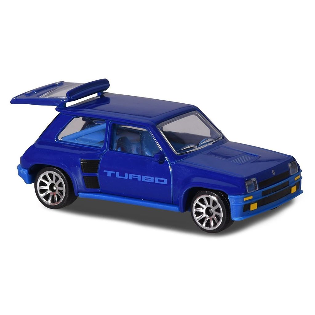 Blå Renault 5 Turbo i skala 1:56 från Majorette och serien Vintage. Bilen har en baklucka som går att öppna och stänga.