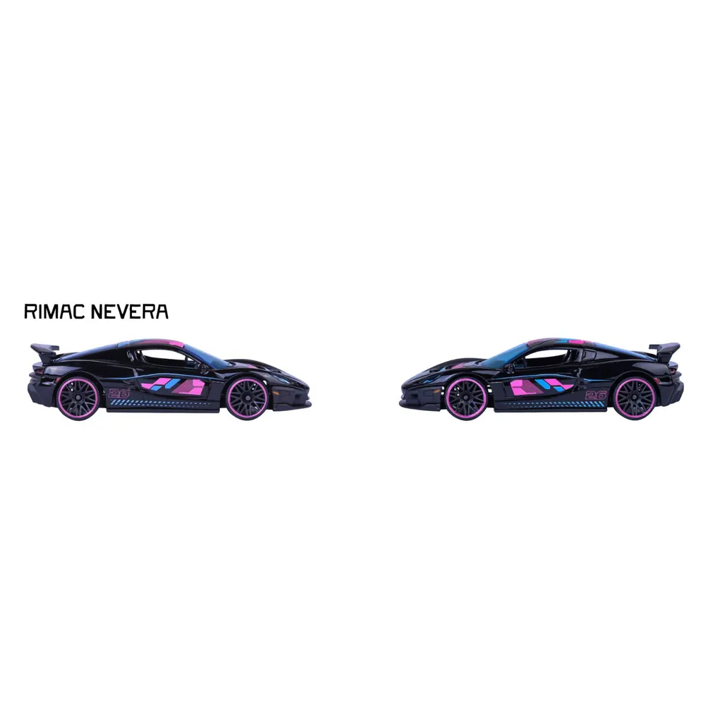 En svart Rimac Nevera med detaljer i neonfärgerna rosa och blå från tillverkaren Majorette.