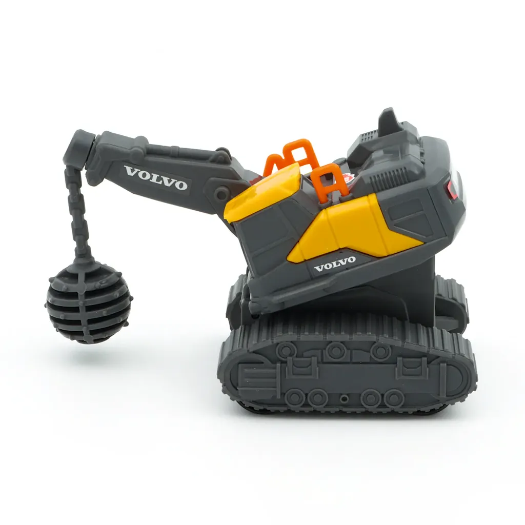 Rivningsgrävare (grävmaskin med rivningskula) från Dickie Toys och serien Mini Movers. Maskinen är en Volvo i plast som är 13 cm lång.