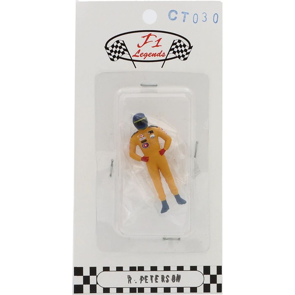 Ronnie Peterson, år 1978, i skala 1:43 (4,3 cm hög). Figur som passar dioramabyggen. Blå hjälm och gul overall.