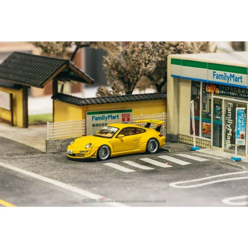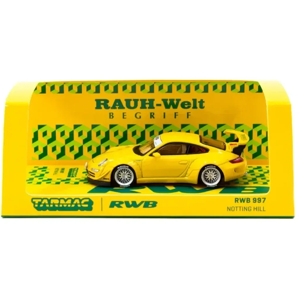 Gul Porsche RWB 911 (997) Notting Hill från modellbilstillverkaren Tarmac Works och serien HOBBY64 i skala 1:64 (7,4 cm).