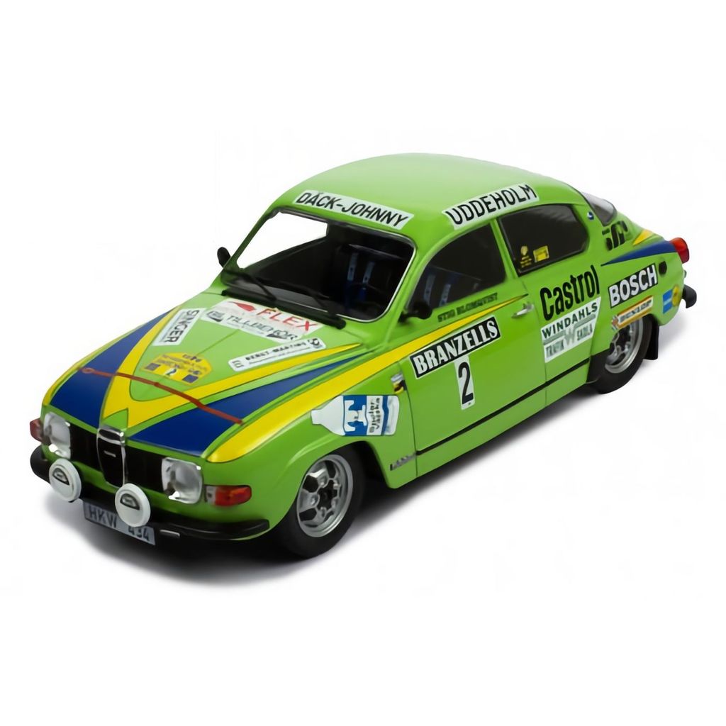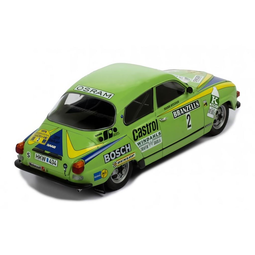 Modellbil från Ixo Models i form av den Saab 96 V4 som Stig Blomqvist och Hans Sylvan körde i Svenska Rallyt 1976. Skalan är 1:18 och färgen grön.