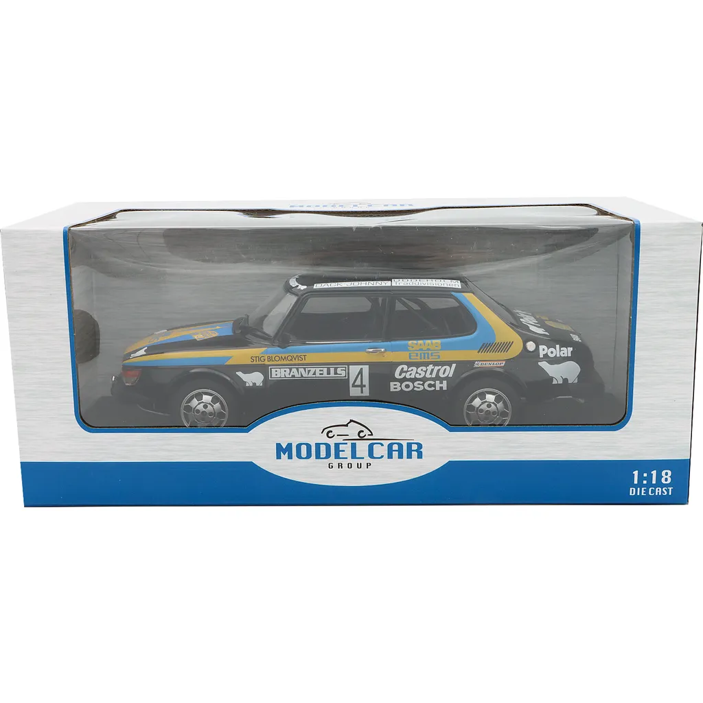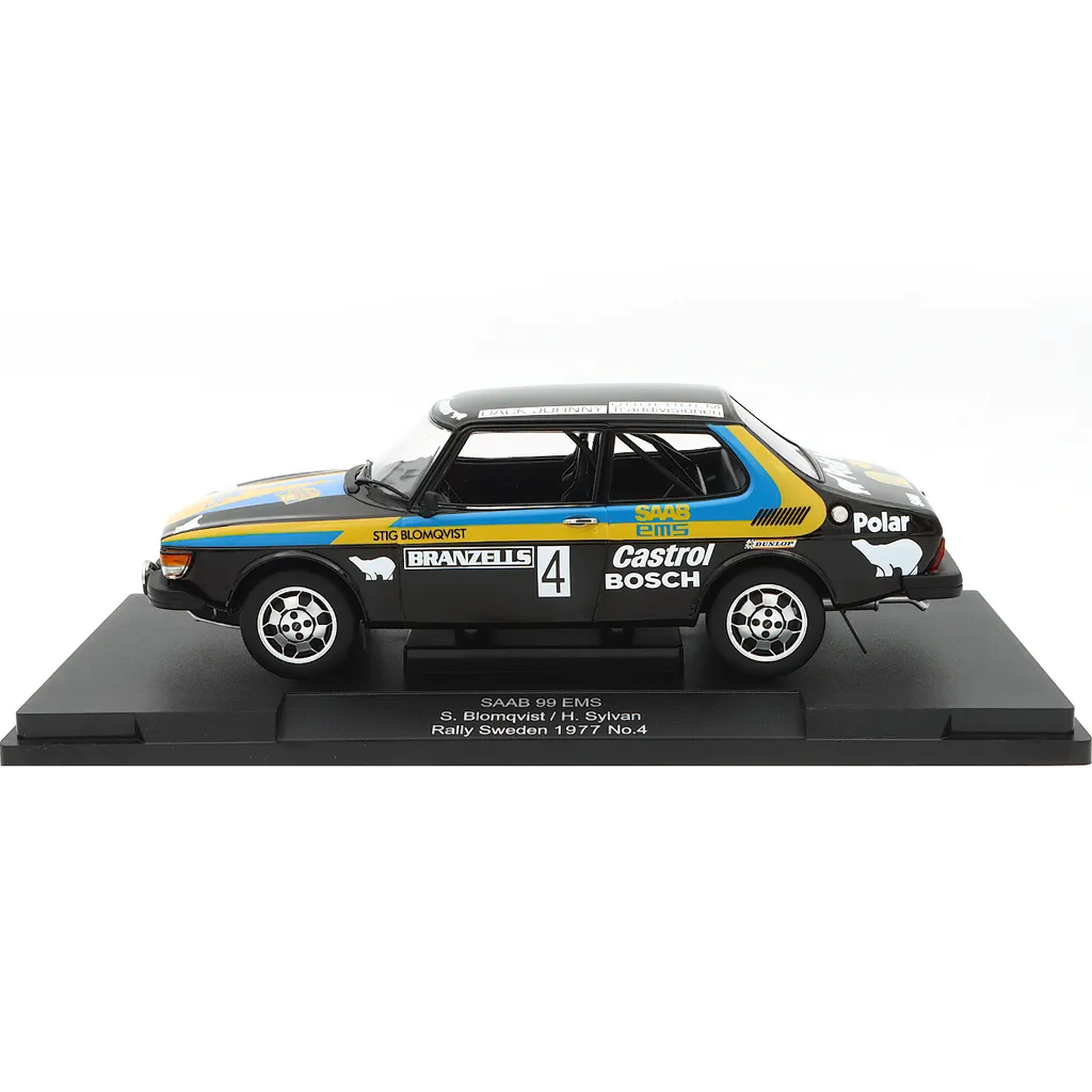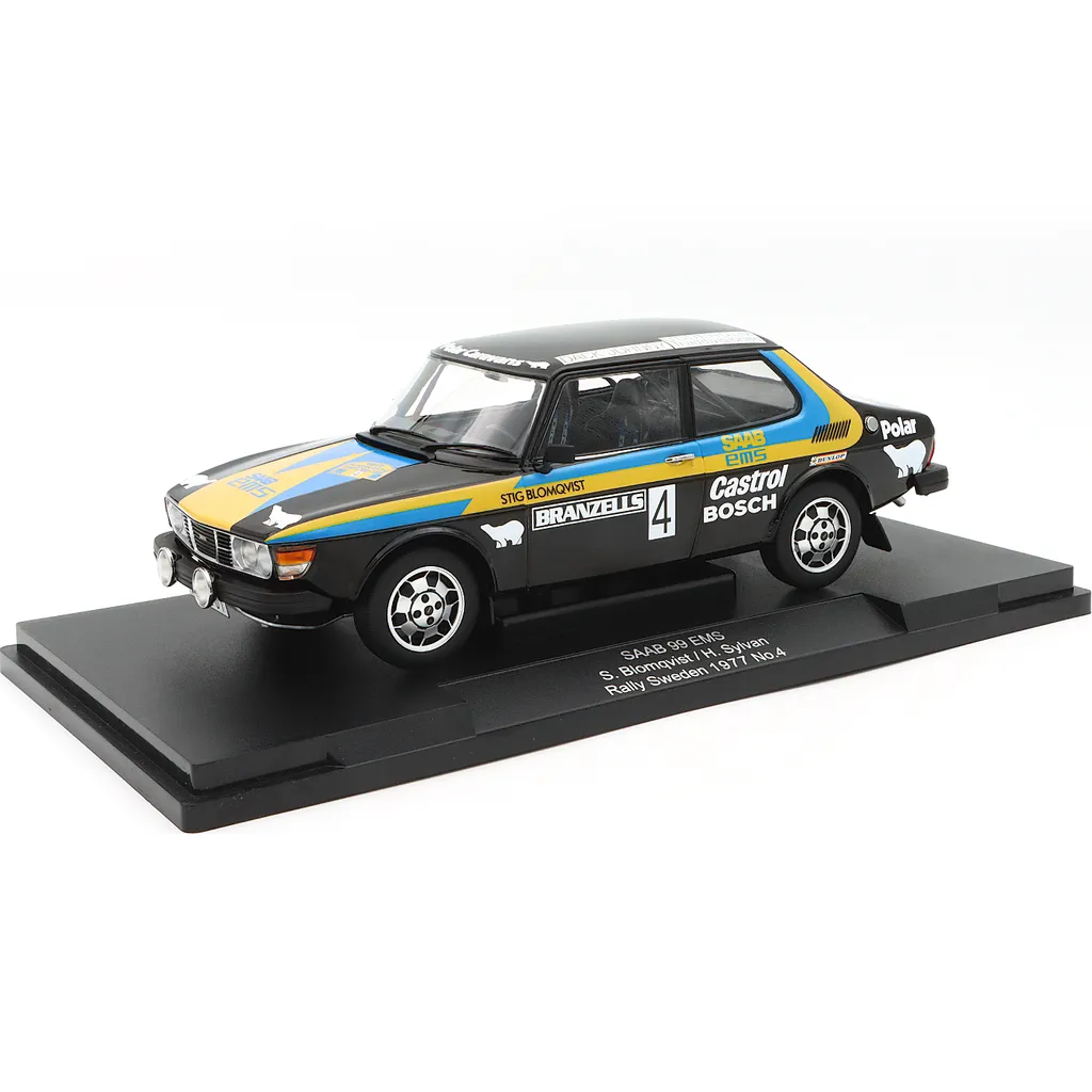 Saab 99 EMS som modellbil från Modelcar Group i skala 1:18 (längd 24 cm). Saaben kördes under Rally Sweden 1977 av Stig Blomqvist och Hans Sylvan som vann rallyt.