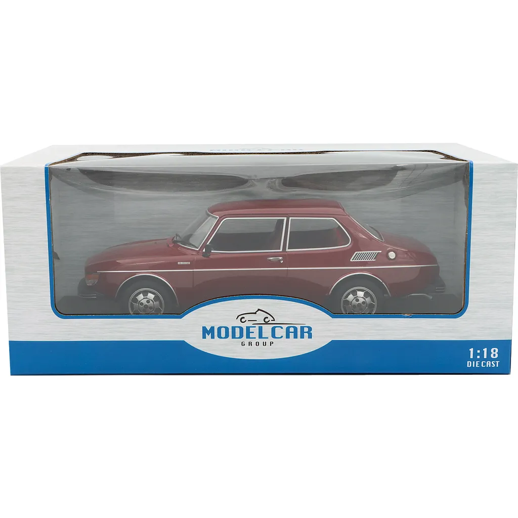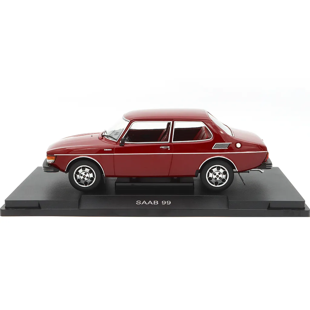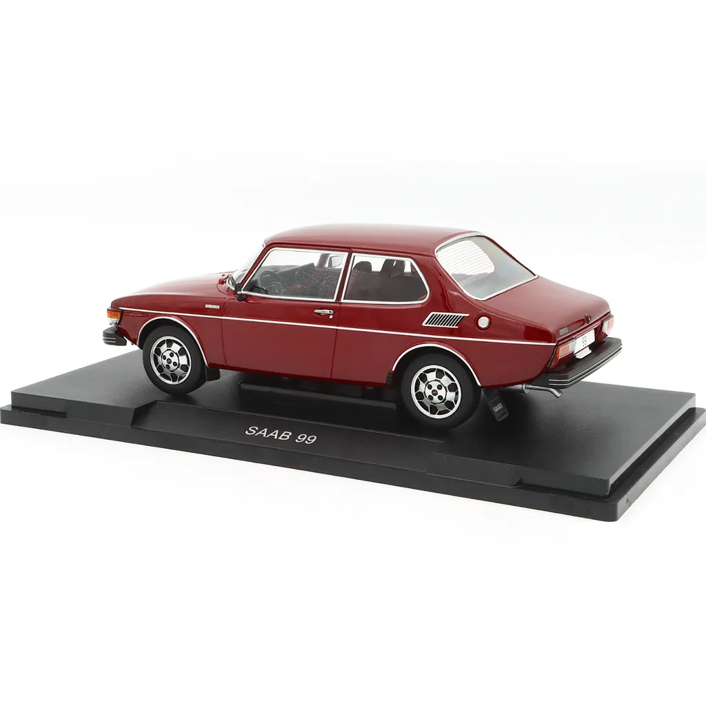 Saab 99 EMS med en mörkröd lack som modellbil från Modelcar Group i skala 1:18 (längd 24 cm). Årsmodellen är 1977.