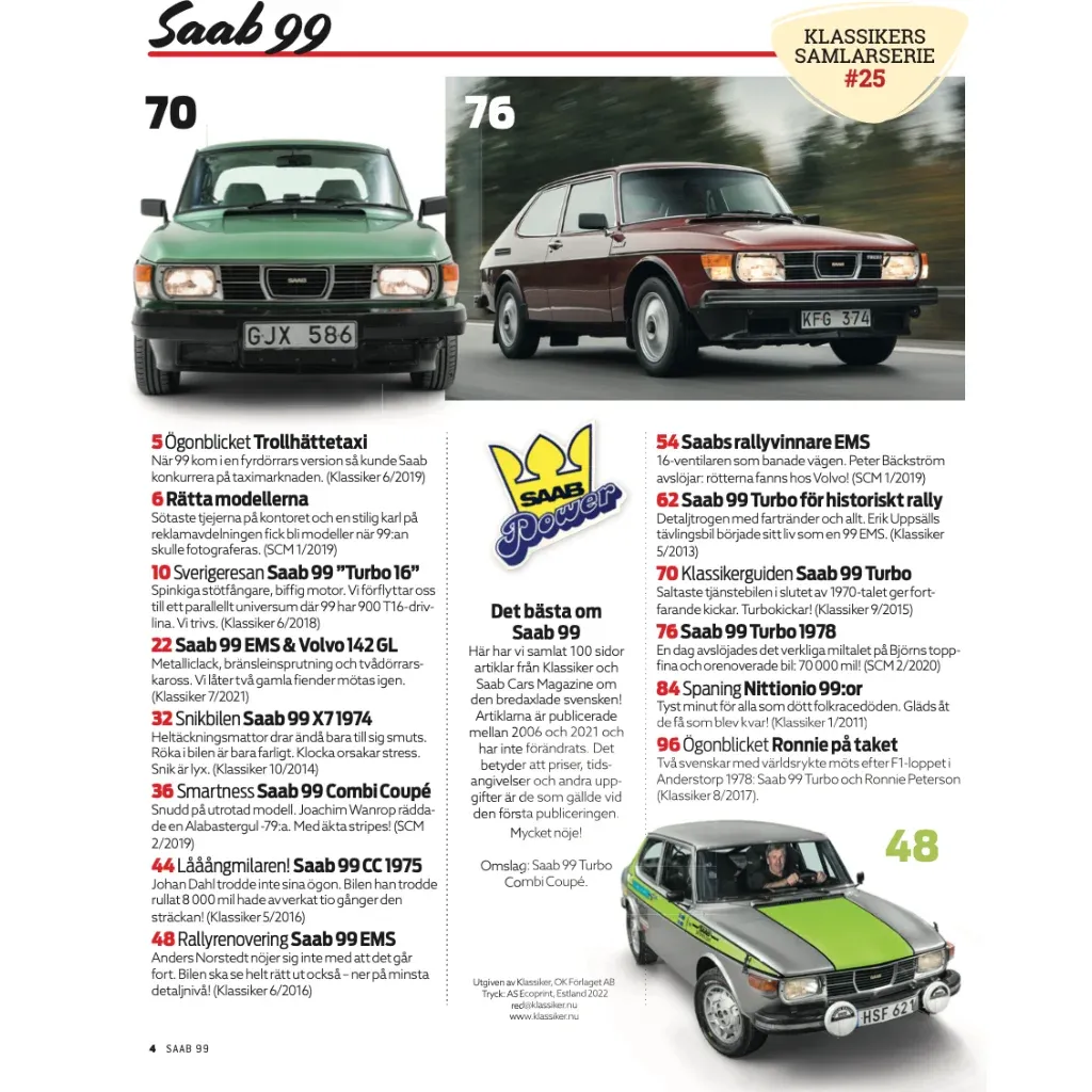 Tidningen är nummer 25 i serien Klassikers Samlarserie som utges av OK Förlaget. Tidningen innehåller artiklar från Klassikers produktion om Saab 99.