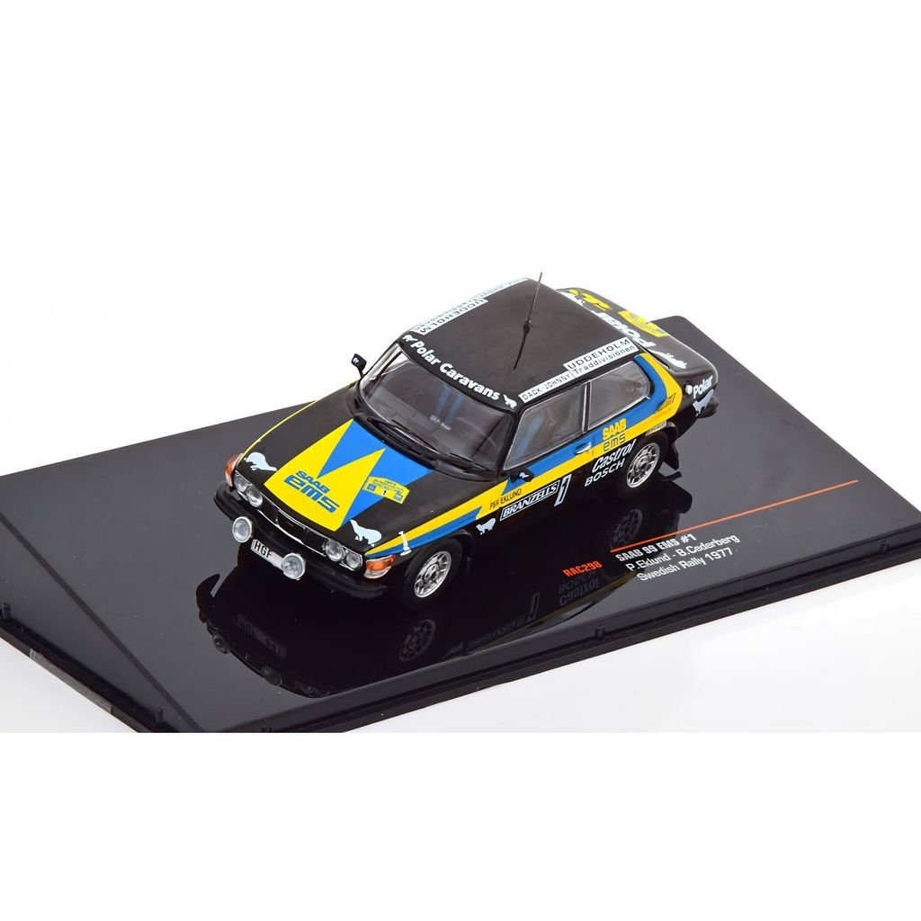 Låt oss presentera denna klassiska svenska rallybil i form av en Saab 99 som kördes av Per Eklund och Björn Cederberg i Svenska Rallyt 1977. Denna modell av rally-Saaben kommer från Ixo Models i skala 1:43. En vacker modell av en vacker bil.