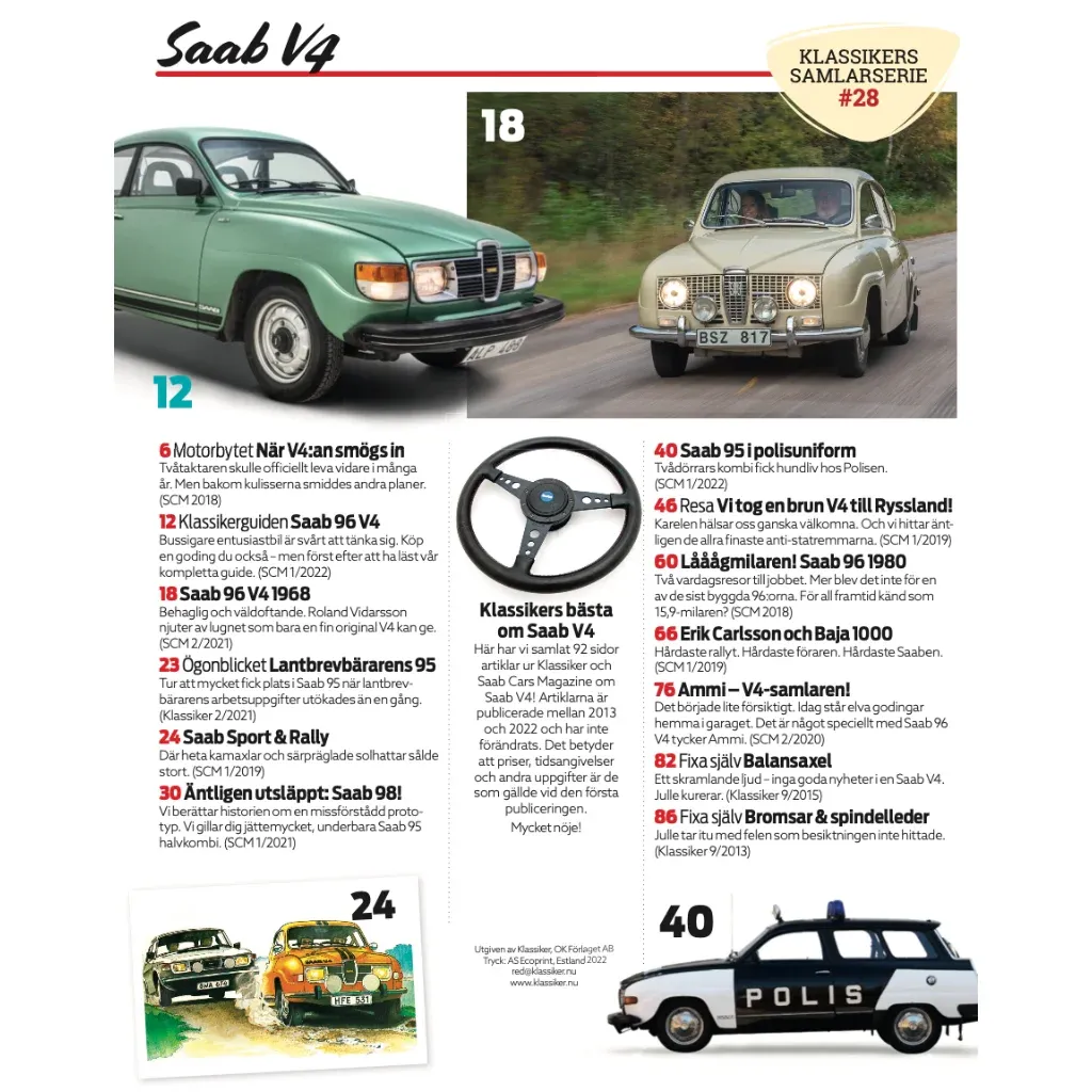 Tidningen är nummer 28 i serien Klassikers Samlarserie som utges av OK Förlaget. Tidningen innehåller artiklar från Klassikers produktion om Saab 96 V4.