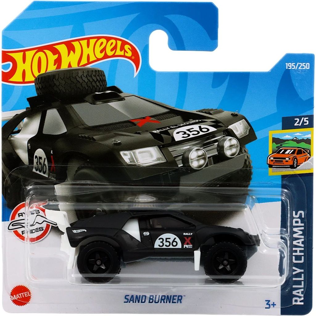 Sand Burner från Hot Wheels och serien Rally Champs där denna leksaksbil är bil nummer 2/5. Bilen är nummer 195/250 från 2022 och har ett short card (5785).