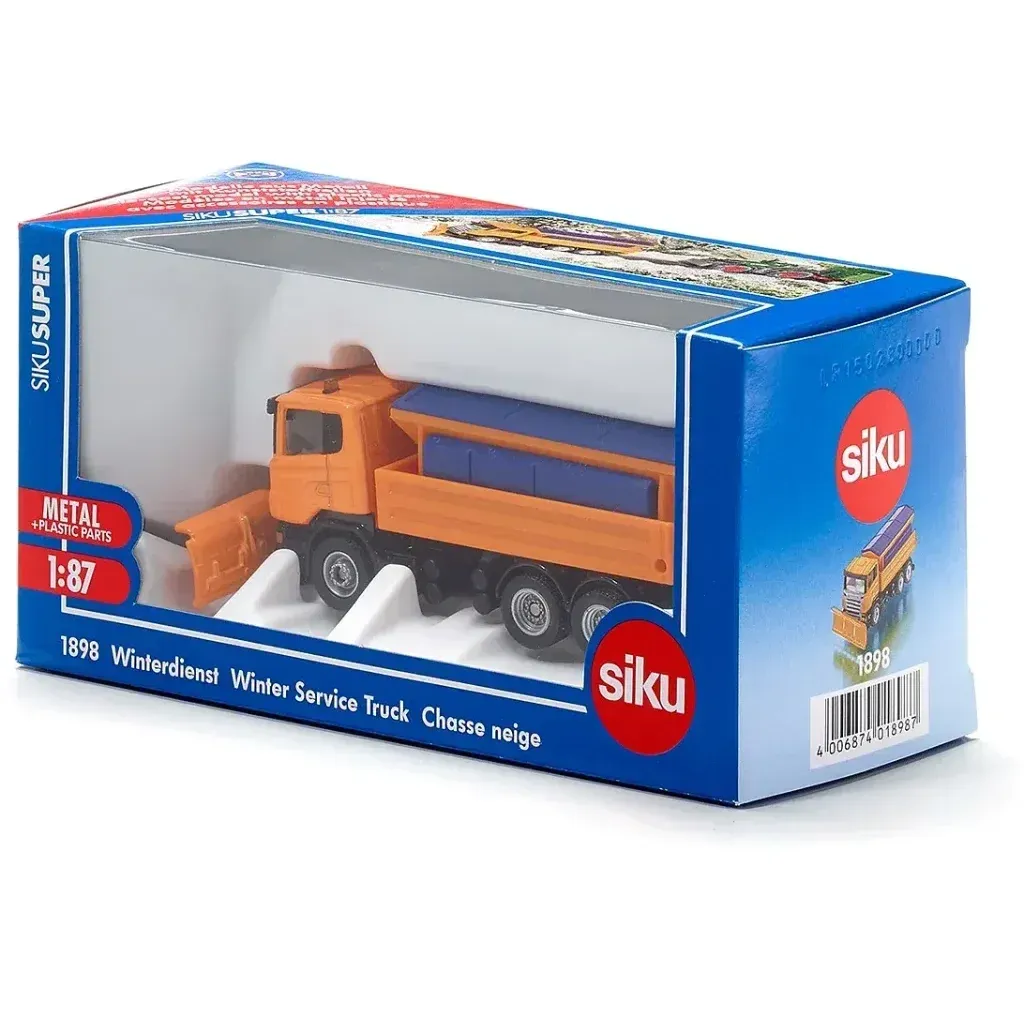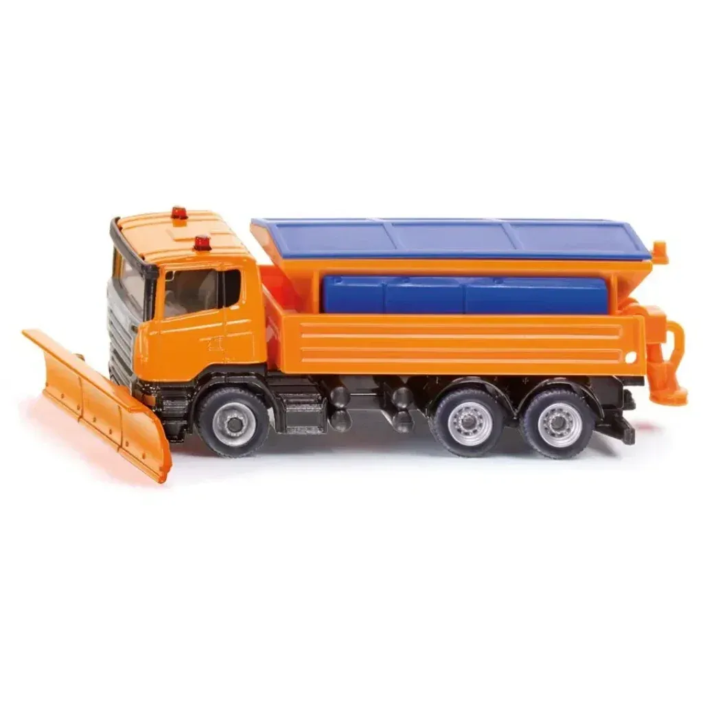 Gul och blå Scania plogbil från Siku. Snöplog fram och spridare för vägsalt bak gör detta till ett optimalt fordon för underhåll av vintervägar. Plogbilen är i skala 1:87 (11 cm).