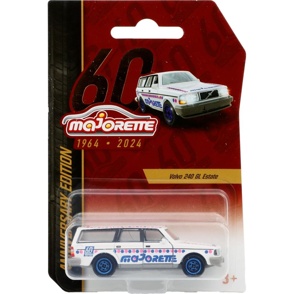 OBS! Något skadad förpackning (liten reva i kortet). Inget fel på bilen. Därav sänkt pris. Skadan syns inte på bilden. Vit Volvo 240 GL Estate från Majorette och serien Anniversary Edition som tagits fram för Majorettes 60-årsjubileum 2024.