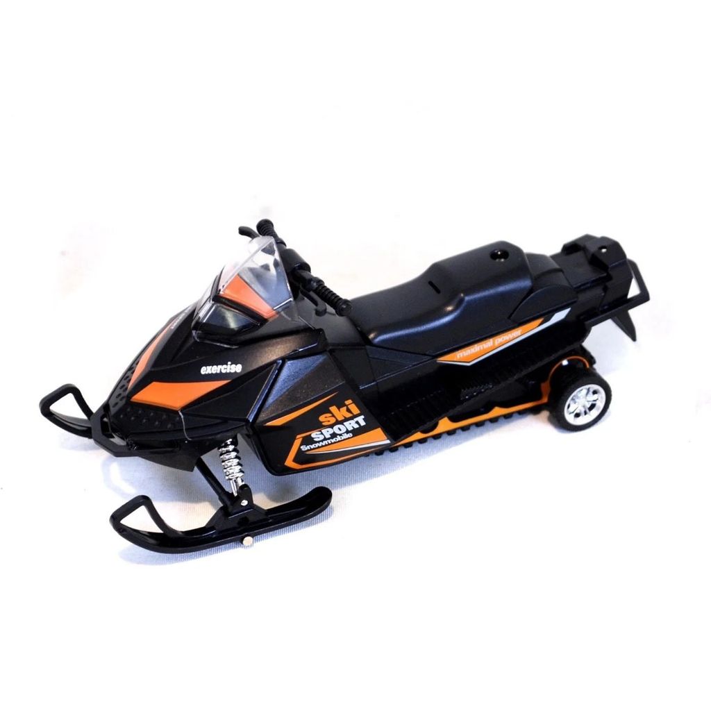 Leksaksskoter med ljud och ljus i metall och plast. Skotern är 17 cm lång (skala 1:32). Skotern är svart med orange detaljer.