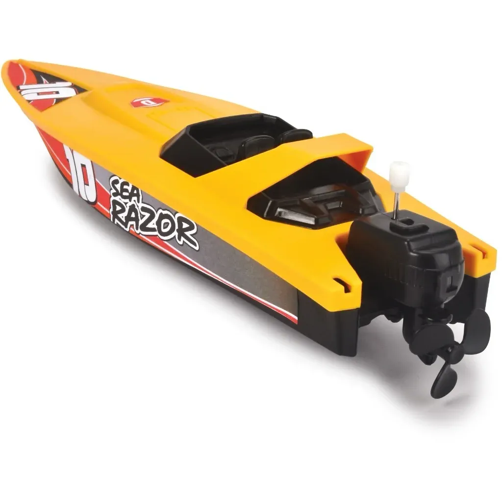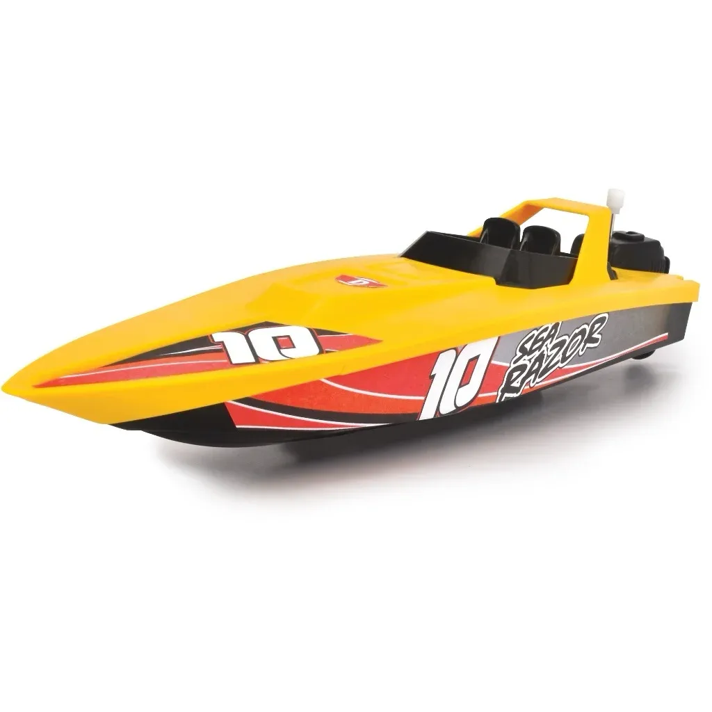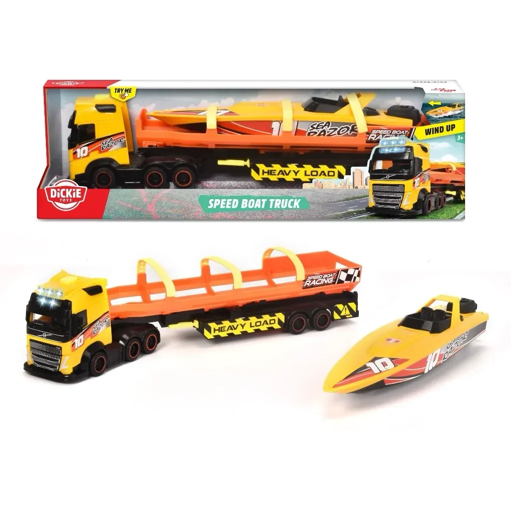 Speed Boat Truck från Dickie Toys är en gul dragbil från Volvo som drar en trailer med en racerbåt. Bilen har ljud- och ljusfunktioner.