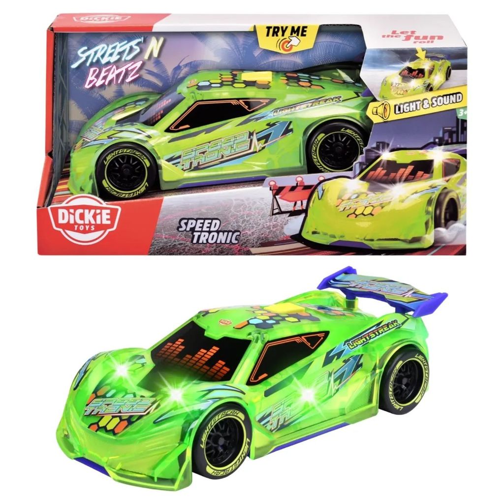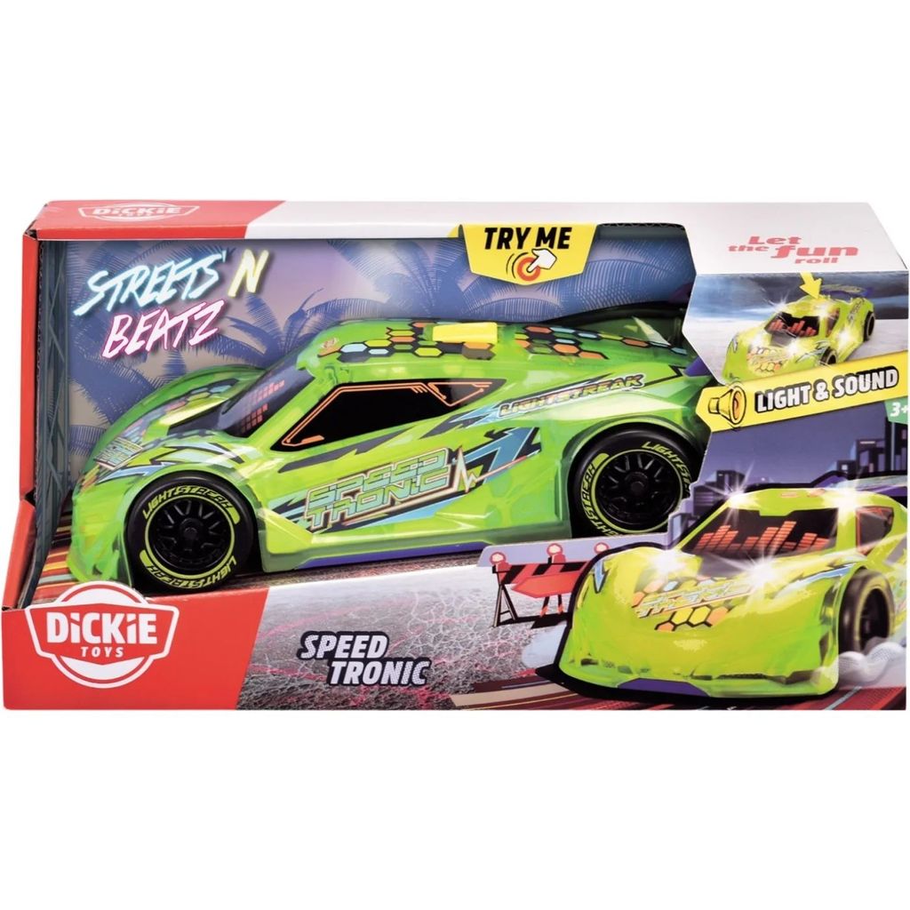 Bilen Speed Tronic från Dickie Toys serie Streets 'N Beatz är en bil med ljud- och ljus. Bilen är 20 cm och batterier ingår.