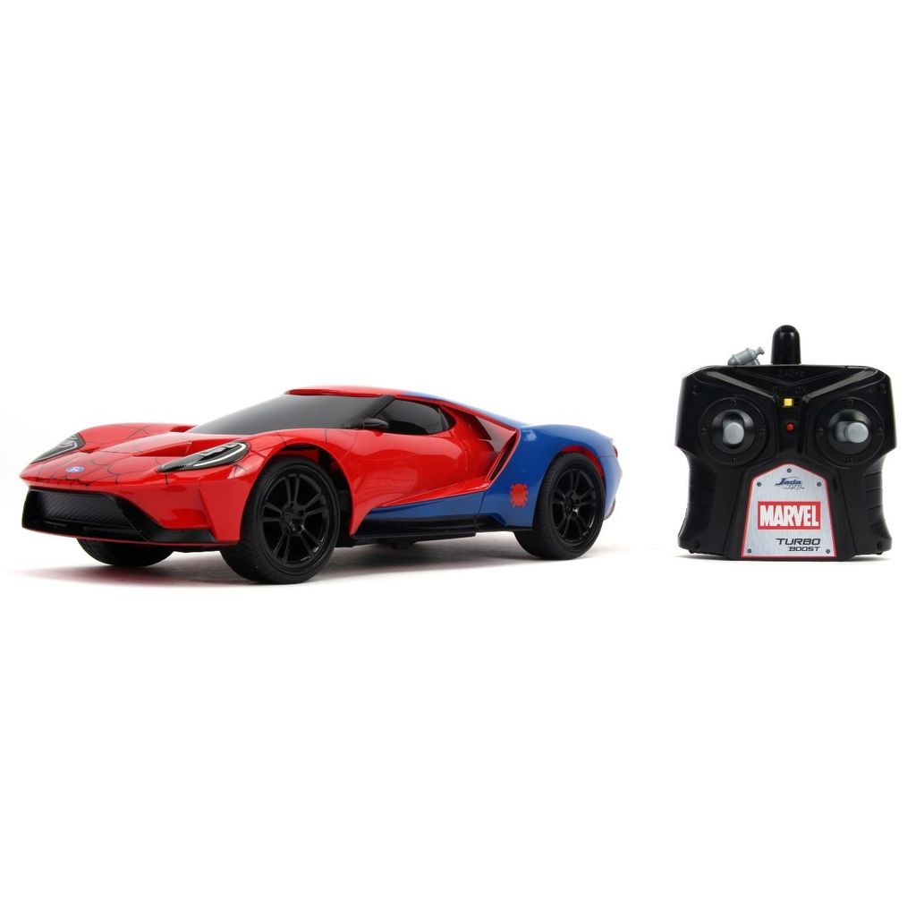 Radiostyrd bil med Spiderman-tema. Bilen är en 2017 Ford GT i skala 1:16.