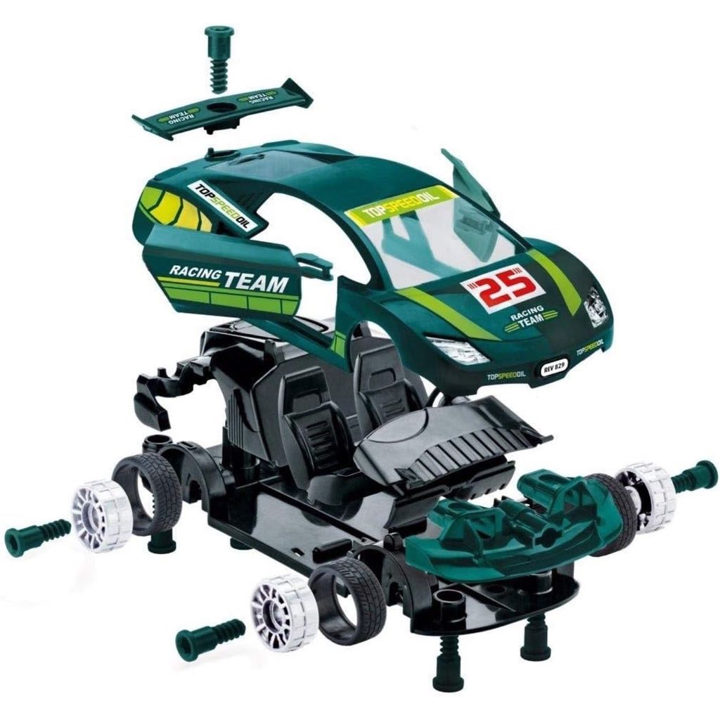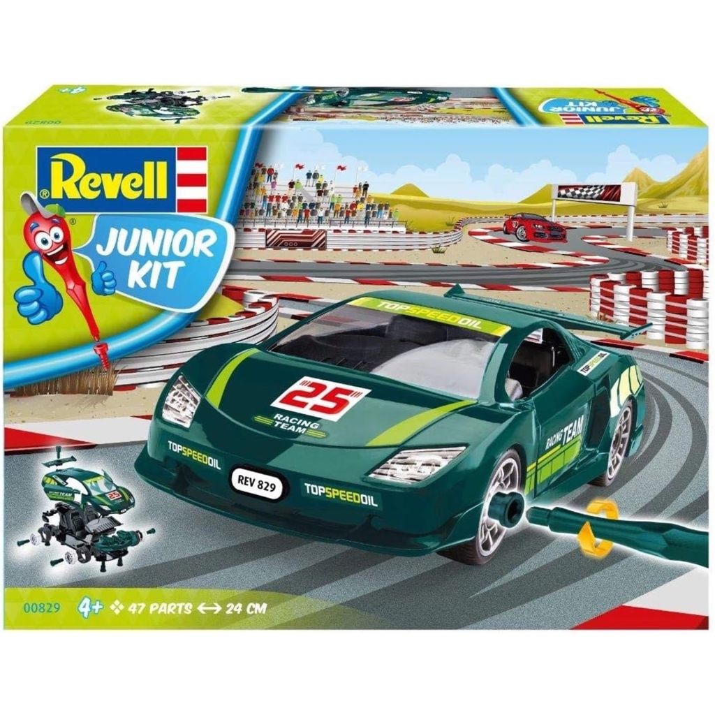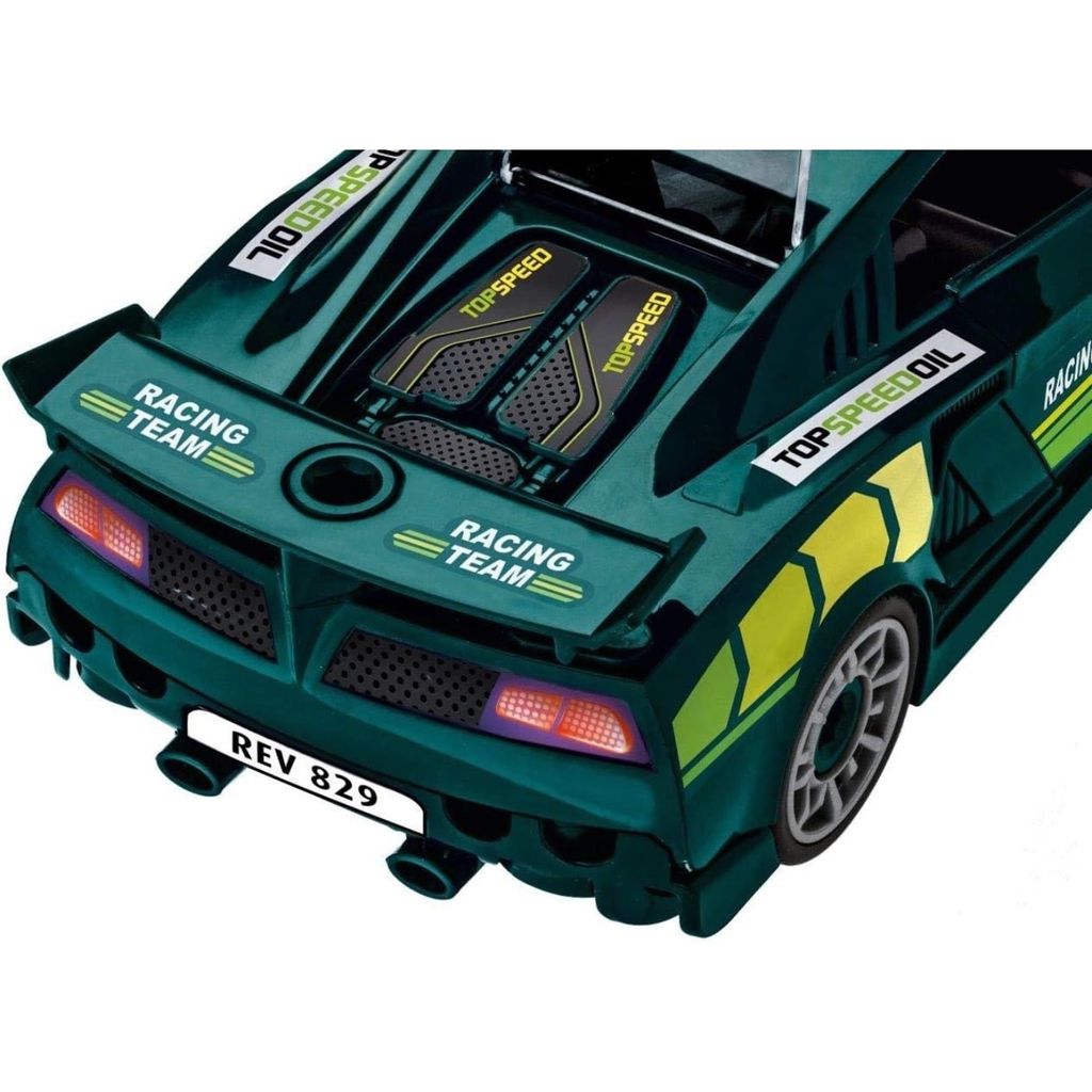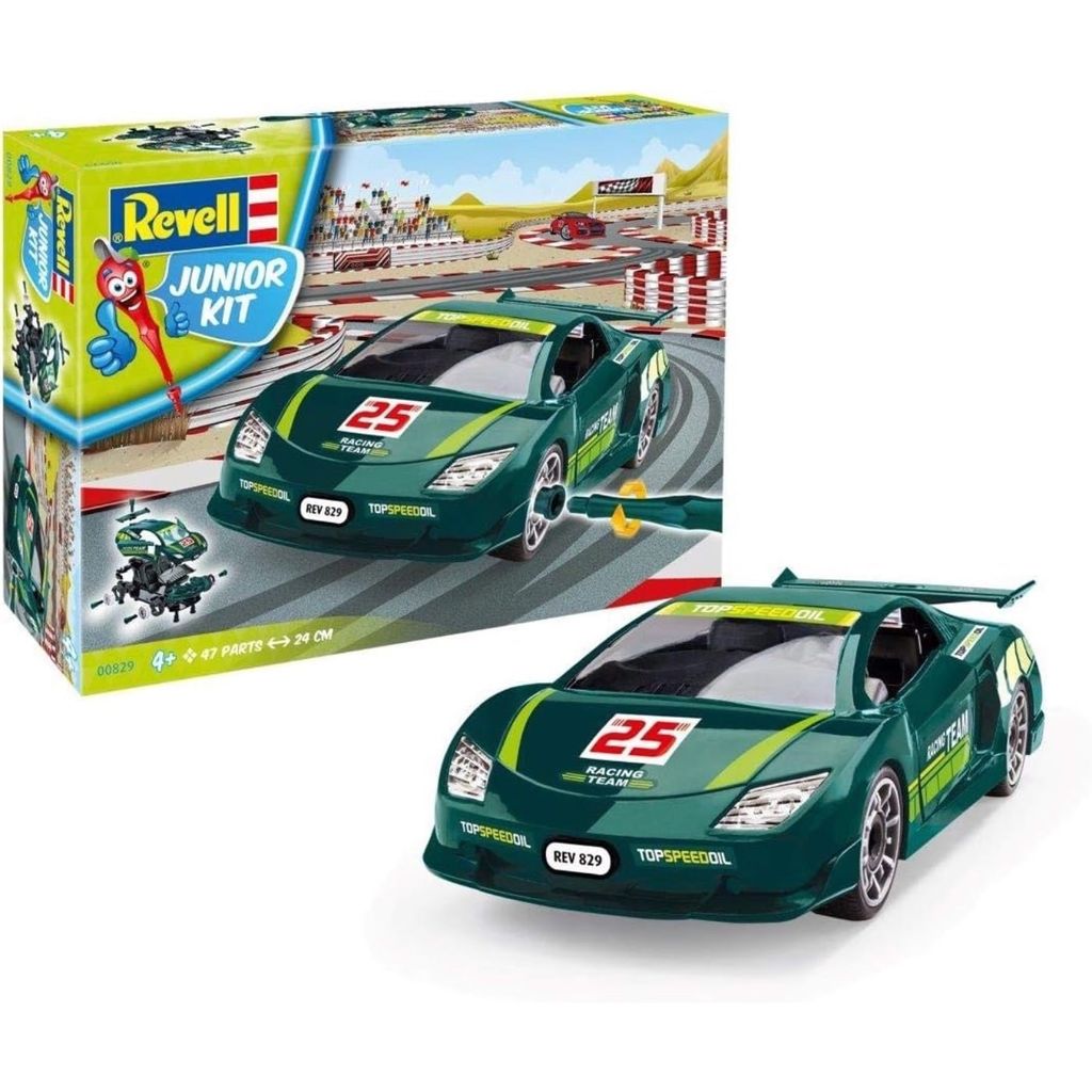 Grön sportbil som byggsats från Revell för små byggare.
