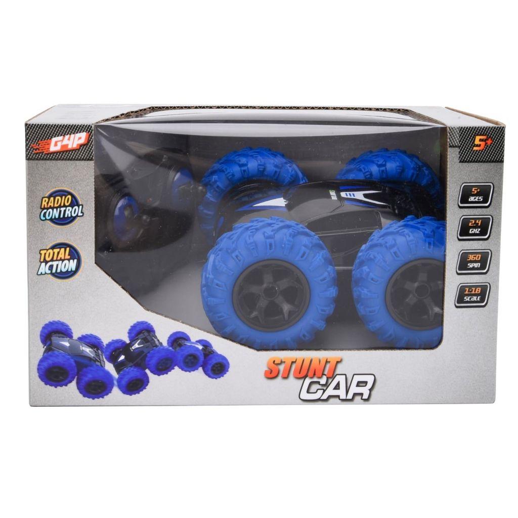 Prisvärd radiostyrd stuntbil från Gear4Play som är rolig att köra och anpassad för mindre barn, den rekommenderas från 5 år. Stuntbilen kan köra på båda sidor och tack vare sina stora stöttåliga hjul så kan den utan problem köra in i väggar och vuxnas fötter utan att någon större skada sker. Bilen kan även göra så kallade 360-spins där bilen snurrar runt på sin position.
