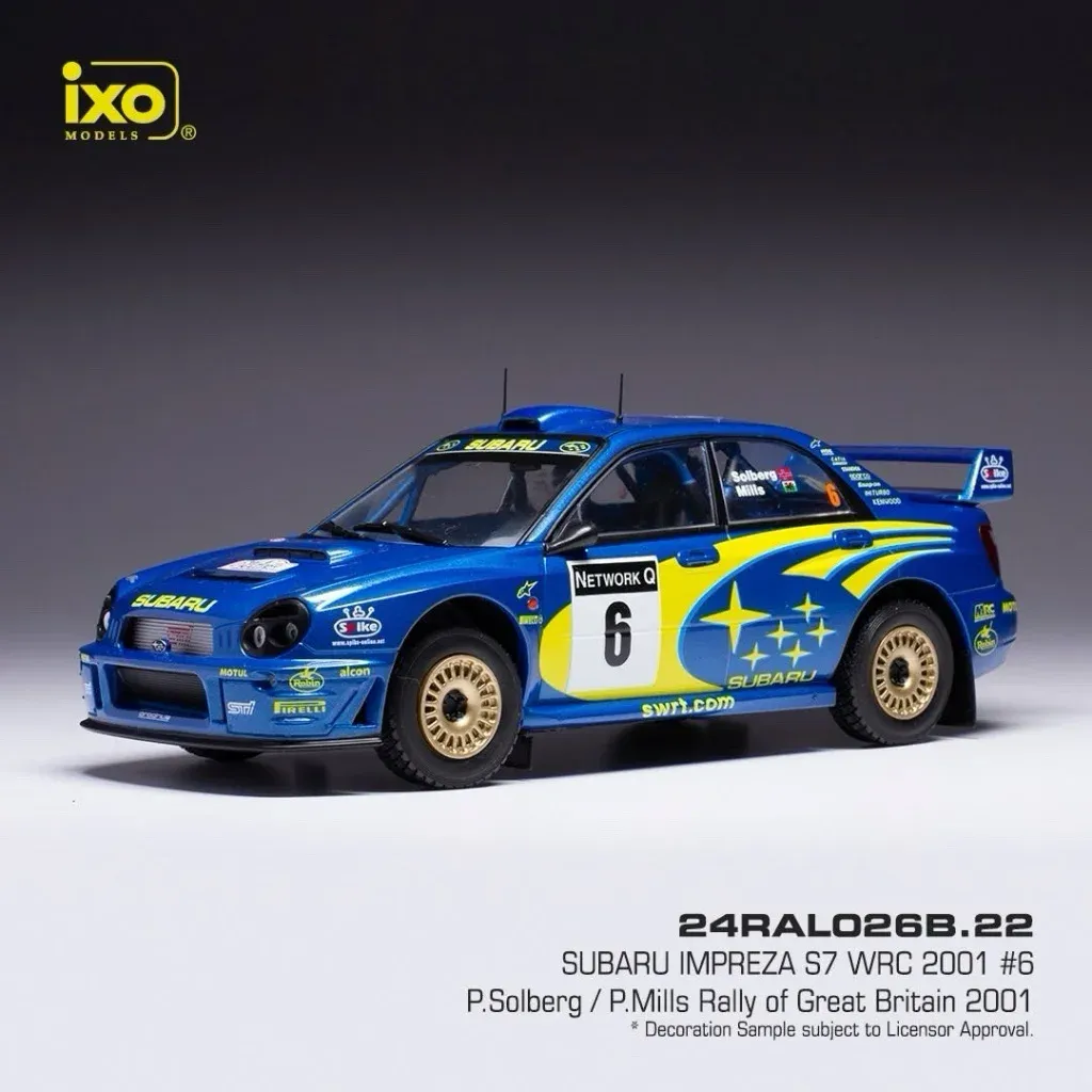 WRC-rallybilen Subaru Impreza S7 WRC med nummer 6 som kördes av Solberg och Mills under Rally of Great Britain 2001. Modellen är tillverkad av Ixo Models i skala 1:24 (18 cm).