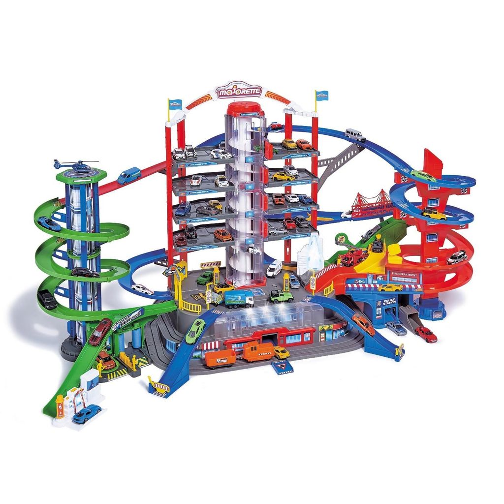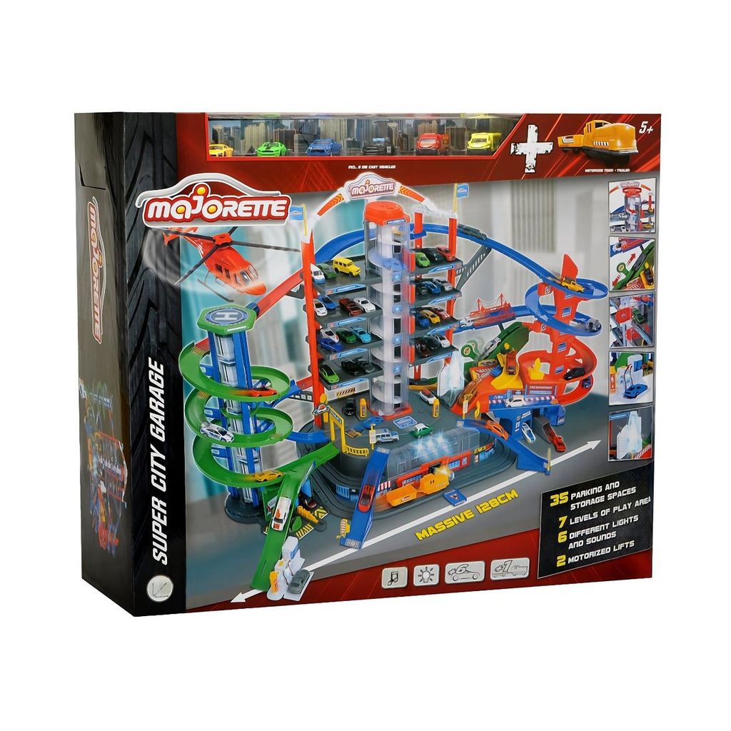 Leksaksgaraget Super City Garage från Majorette har sju våningar och flertalet ramper, vägar, hissar och 35 parkeringsplatser. Garaget har även ljud- och ljusfunktioner samt två batteridrivna hissar.