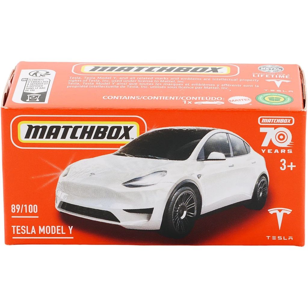 Tesla Model Y från Matchbox och serien Power Grab där denna leksaksbil är bil nummer 89/100.