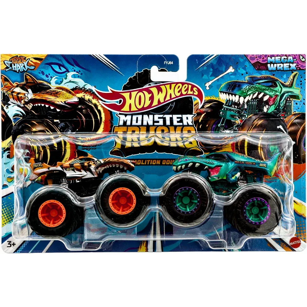 2-pack med monster trucks från Hot Wheels. I detta pack ingår truckarna Tiger Shark och Mega-Wrex.