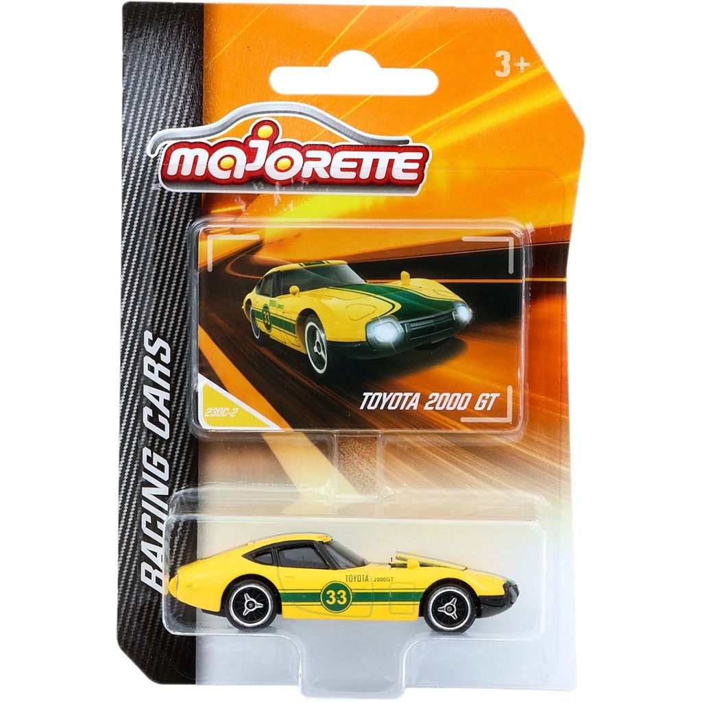 Gul Toyota 2000 GT från Majorette och serien Racing Cars. Skalan är 1:56 vilket ger Toyotan en längd på 7,7 cm.